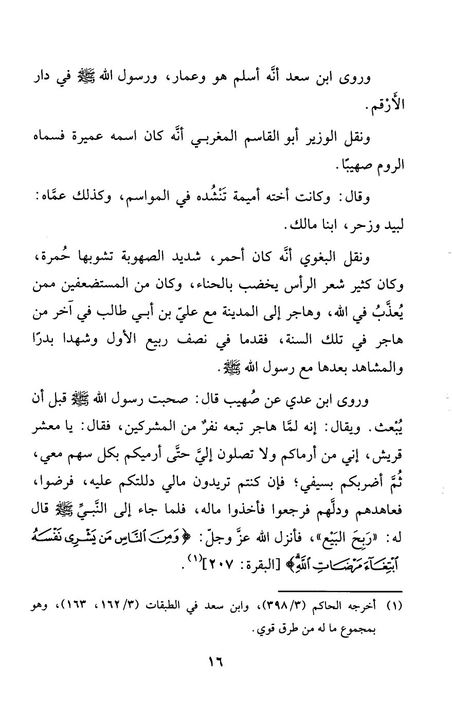 وروى ابن عدي عن صُهيب قال: صحبت رسول الله - صلى الله عليه وسلم - قبل أن يُبْعث. ويقال: إنه لما هاجر تبعه نفرٌ من المشركين، فقال: يا معشر قريش، إني من أرماكم ولا تصلون إليَّ حتَّى أرميكم بكل سهم معي، ثُمَّ أضربكم بسيفي؛ فإن كنتم تريدون مالي دللتكم عليه، فرضوا، فعاهدهم ودلَّهم فرجعوا فأخذوا ماله، فلما جاء إلى النَّبيِّ - صلى الله عليه وسلم - قال له: "رَبِحَ البَيْع"، فأنزل الله عزَّ وجلّ: {وَمِنَ النَّاسِ مَنْ يَشْرِي نَفْسَهُ ابْتِغَاءَ مَرْضَاتِ اللَّهِ} [البقرة: 207] (¬1).