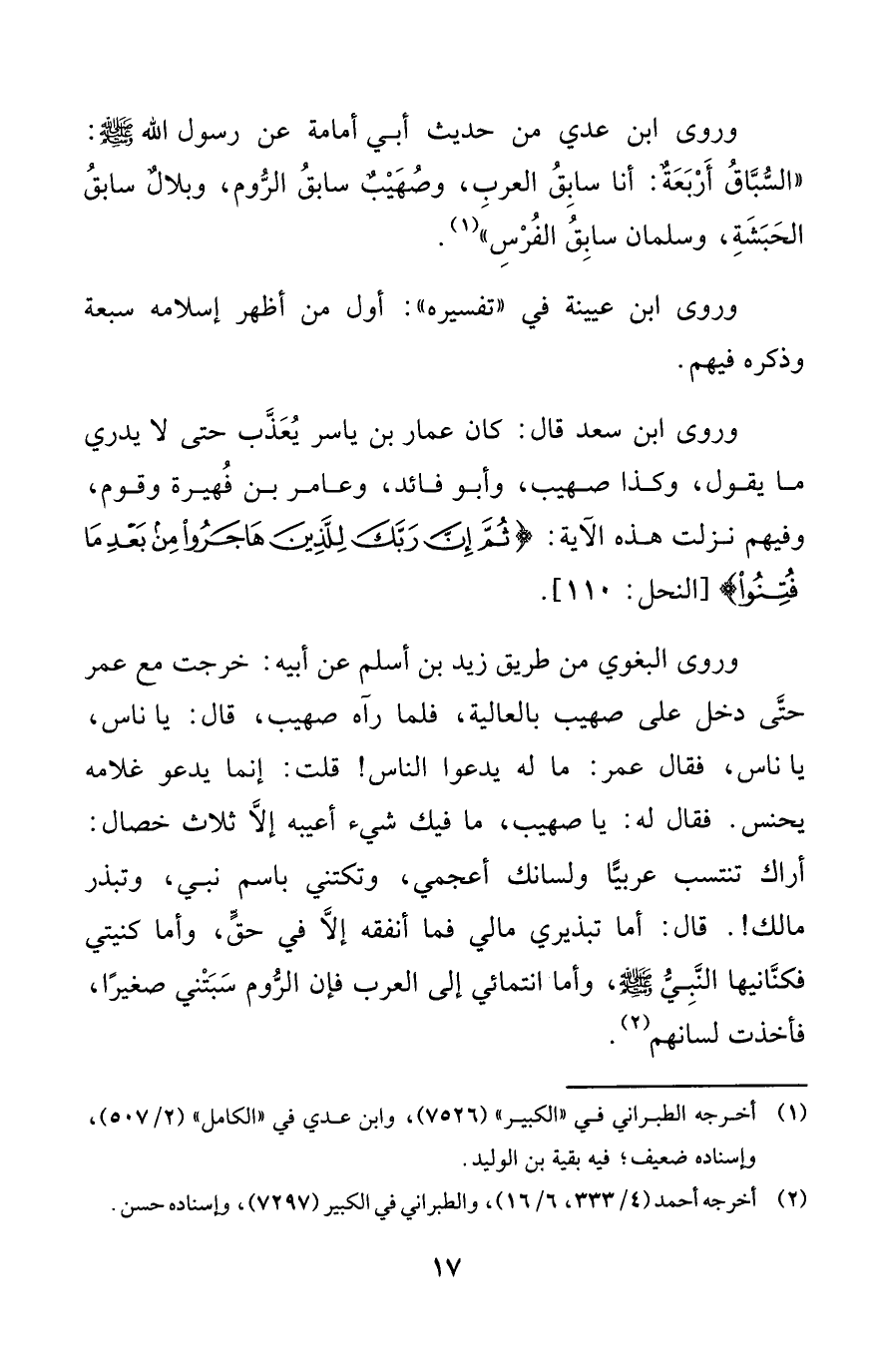 وروى ابن عدي من حديث أبي أمامة عن رسول الله - صلى الله عليه وسلم -: "السُّبَّاقُ أَرْبَعَةٌ: أنا سابِقُ العربِ، وصُهَيْبٌ سابقُ الرُّوم، وبلالٌ سابقُ الحَبَشَةِ، وسلمان سابِقُ الفُرْسِ" (¬1).