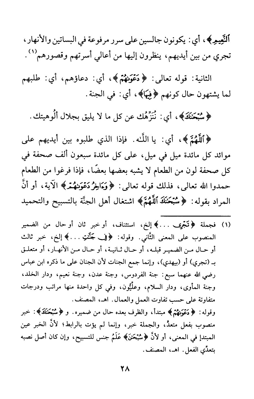 {اللَّهُمَّ}، أي: يا الله. فإذا الذي طلبوه بين أيديهم على موائد كل مائدة ميل في ميل، على كل مائدة سبعون ألف صحفة في كل صحفة لون من الطعام لا يشبه بعضها بعضًا، فإذا فرغوا من الطعام حمدوا الله تعالى، فذلك قوله تعالى: {وَآخِرُ دَعْوَاهُمْ} الآية، أو أنَّ المراد بقوله: {سُبْحَانَكَ اللَّهُمَّ} اشتغال أهل الجنَّة بالتسبيح والتحميد