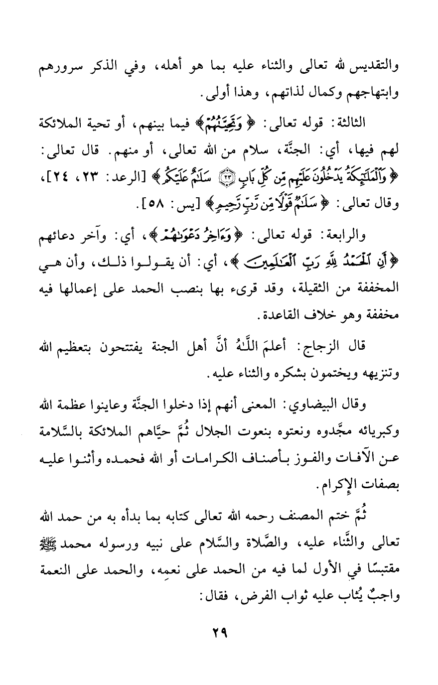 وقال البيضاوي: المعنى أنهم إذا دخلوا الجنَّة وعاينوا عظمة الله وكبريائه مجَّدوه ونعتوه بنعوت الجلال ثُمَّ حيَّاهم الملائكة بالسَّلامة عن الآفات والفوز بأصناف الكرامات أو الله فحمده وأثنوا عليه بصفات الإِكرام.