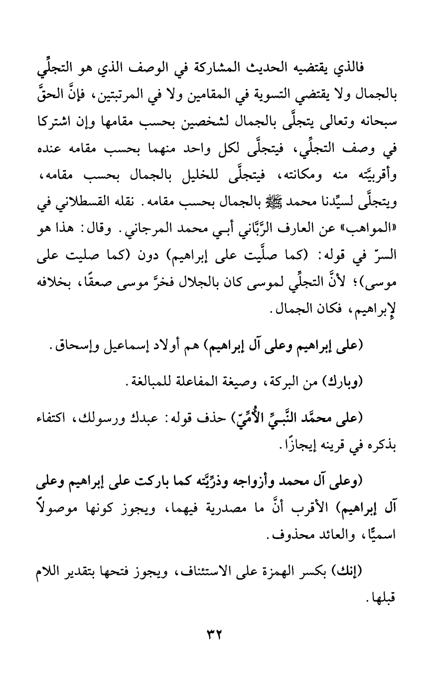 فالذي يقتضيه الحديث المشاركة في الوصف الذي هو التجلِّي بالجمال ولا يقتضي التسوية في المقامين ولا في المرتبتين، فإنَّ الحقَّ سبحانه وتعالى يتجلَّى بالجمال لشخصين بحسب مقامهما وإن اشتركا في وصف التجلِّي، فيتجلَّى لكل واحد منهما بحسب مقامه عنده وأقربيَّته منه ومكانته، فيتجلَّى للخليل بالجمال بحسب مقامه، ويتجلَّى لسيِّدنا محمَّد - صلى الله عليه وسلم - بالجمال بحسب مقامه. نقله القسطلاني في "المواهب" عن العارف الرَّبَّاني أبي محمَّد المرجاني. وقال: هذا هو السرّ في قوله: (كما صلَّيت على إبراهيم) دون (كما صليت على موسى)؛ لأنَّ التجلي لموسى كان بالجلال فخرَّ موسى صعقًا، بخلافه لإِبراهيم، فكان الجمال.