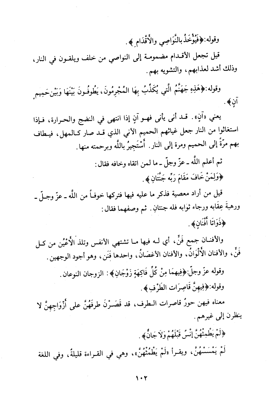 وقال عكرمة في قوله تعالى (ذَواتَا أَفْنانٍ) قال ظِلُّ الأغصانِ على الحِيطانِ وقال أَبو الهيثم فسره بعضهم ذَواتا أغصانٍ وفسره بعضهم ذواتا أَلوان واحدها حينئذ فَنّ وفَنَنٌ كما قالوا سَنٌّ وسَنَنٌ وعَنٌّ وعَنَنٌ قال أَبو منصور واحدُ الأَفنان إذا أَردت بها الأَلوان فَنٌّ وإذا أردْتَ بها الأغصان فواحدها فَنَنٌ أَبو عمرو شجرة فَنْواء ذات أَفنان قال أبو عبيد وكان ينبغي في التقدير فَنَّاء ثعلب شجرة فَنَّاء وفَنْواء ذات أَفْنانٍ وأَما قَنْواء بالقاف فهي الطويلة قال أَبو الهيثم الفُنُون تكون في الأغصان والأغصان تكون في الشُّعَبِ والشُّعَبُ تكون في السُّوق وتسمى هذه الفُروعُ يعني فروعَ الشجر الشَّذَبَ والشَّذَبُ العِيدانُ التي تكون في الفُنون ويقال للجِذعِ إذا قطع عند الشَّذَب جِذْعٌ مُشَذَّبٌ قال امرؤ القيس يُرادَا على مِرْقاةِ جِذْعٍ مُشَذَّبِ يُرادا أي يُدارا يقال رادَيْتُه ودارَيْتُه والفَنَنُ الفَرْع من الشجر والجمع كالجمع وفي حديث سِدْرة المُنْتَهَى يسير الراكب في ظِلِّ الفَنَنِ مائةَ سَنةٍ وامرأَة فَنْواء كثيرة الشعر والقياس في كل ذلك فَنَّاء وشعَر فَيْنان قال سيبويه معناه أَن له فنوناً كأَفنانِ الشجر ولذلك صرف ورجل فَيْنان وامرأَة فَينانة قال ابن سيده وهذا هو القياس لأَن المذكر فَيْنان مصروف مشتق من أَفنان الشجر وحكي ابن الأَعرابي امرأَة فَيْنَى كثيرة الشعر مقصور قال فإن كان هذا كما حكاه فحكم فَيْنان أن لا ينصرف قال وأُرى ذلك وهَماً من ابن الأَعرابي وفي الحديث أَهلُ الجنة مُرْدٌ مُكَحَّلون أُولو أَفانِين يريد أُولو شُعور وجُمَم وأَفانِينُ جمع أَفنان وأَفنانٌ جمع فَنَنٍ وهو الخُصلة من الشعر شبه بالغصن قال الشاعر يَنْفُضْنَ أَفنانَ السَّبيبِ والعُذَرْ يصف الخيلَ ونَفْضَها خُصَل شعر نواصيها وأَذنابها وقال المَرَّار أَعَلاقَةً أُمَّ الوُلَيِّد بعدَما أَفْنانُ رأْسِك كالثَّغام المُخْلِسِ؟ يعني خُصَلَ جُمَّة رأْسِه حين شاب أَبو زيد الفَينان الشعر الطويل الحسَنُ قال أَبو منصور فَيْنانٌ فَيعال من الفَنَن والياء زائدة التهذيب وإن أَخذت قولهم شعر فَيْنانٌ من الفَنَن وهو الغصن صرفته في حالي النكرة والمعرفة وإن أَخذته من الفَيْنة وهو الوقت من الزمان أَلحقته بباب فَعْلان وفَعْلانة فصرفته في النكرة ولم تصرفه في المعرفة وفي الحديث جاءَت امرأَةٌ تشكو زوجَها فقال النبي صلى الله عليه وسلم تُرِيدينَ أن تزَوَّجِي ذا جُمَّةٍ فَينانة على كل خُصلة منها شيطان الشعر الفَيْنانُ الطويل الحسن والياء زائدة ويقال فَنَّنَ فلانٌ رأْيه إذا لَوَّنه ولم يثبت على رأْي واحد والأَفانِينُ الأَساليب وهي أَجناس الكلام وطُرُقه ورجل مُتفَنِّنٌ أي ذو فُنون وتَفنَّنَ اضطرب كالفَنَن وقال بعضهم تَفنَّن اضطرب ولم يَشْتقَّه من الفَنن والأَول أَولى قال لو أَن عُوداً سَمْهَريّاً من قَنا أو من جِيادِ الأَرْزَناتِ أَرْزَنا لاقى الذي لاقَيْتُه تَفنَّنا والأُفْنونُ الحية وقيل العجوز وقيل العجوز المُسِنَّة وقيل الداهية وأَنشد ابن بري لابن أَحمر في الأُفْنون العجوز شَيْخٌ شآمٍ وأُفْنونٌ يَمانِيةٌ من دُونِها الهَوْلُ والمَوْماة والعِلَلُ وقال الأَصمعي الأُفْنون من التَّفَنُّن قال ابن بري وبيت ابن أَحمر شاهد لقول الأَصمعي وقولُ يعقوب إنَّ الأُفْنون العجوز بعِيدٌ جدّاً لأَنَّ ابنَ أَحمر قد ذكر قبل هذا البيت ما يَشْهَد بأَنها محبوبته وقد حال بينه وبينها القَفْرُ والعِلل والأُفْنون من الغُصن المُلتفُّ والأُفنون الجَرْيُ المختلط من جَرْي الفرس والناقة والأُفنون الكلام المُثبَّجُ من كلام الهِلْباجة وأُفْنون اسم امرأَة وهو أَيضاً اسم شاعرسمي بأَحد هذه الأَشياء والمُفَنَّنة من النساء الكبيرة السيئة الخُلُق ورجل مُفَنَّنٌ كذلك والتَّفْنِينُ فِعْلُ الثَّوْب إذا بَلِيَ فتفَزَّرَ بعضهُ من بعض وفي المحكم التَّفْنِينُ تفَزُّر الثوب إذا بَليَ من غير تشقق شديد وقيل هو اختل