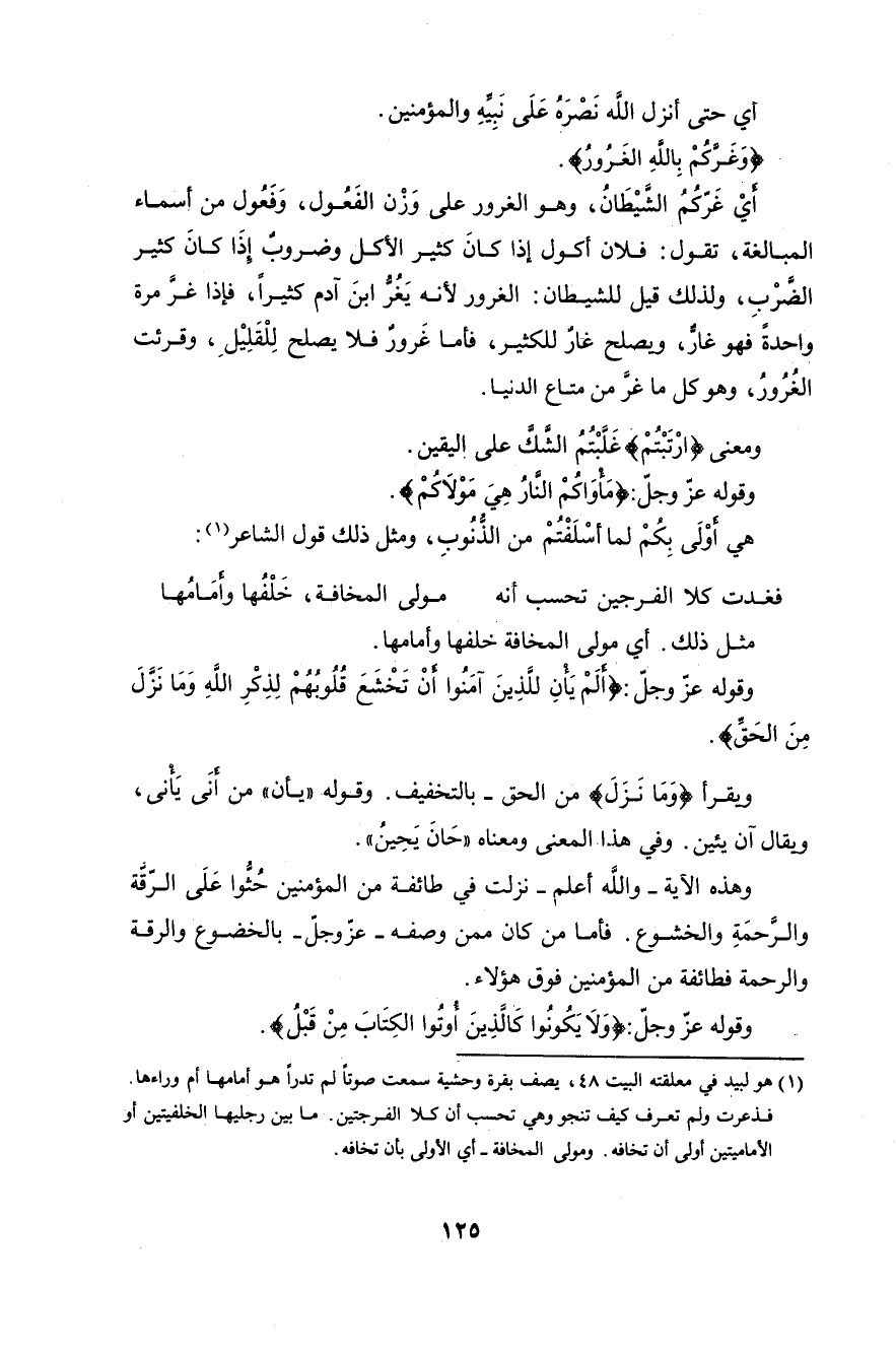 الضرْبِ، ولذلك قيل للشيطان: الغرور لأنه يَغُرُّ ابنَ آدم كثيراً، فإذا غرَّ مرة واحدةً فهو غارٌّ، ويصلح غارٌّ للكثير، فأمَّا غَرُورُ فلا يصلح لِلْقَلِيْلِ، وقرئت (الغُرُورُ) وهو كل ما غرَّ من متاع الدنيا.