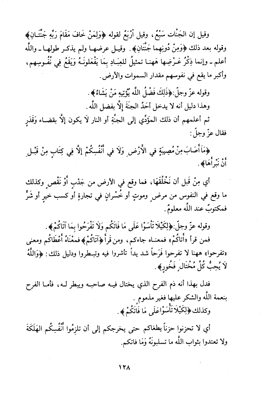وقوله عزَّ وجلَّ: (لِكَيْلَا تَأْسَوْا عَلَى مَا فَاتَكُمْ وَلَا تَفْرَحُوا بِمَا آتَاكُمْ وَاللَّهُ لَا يُحِبُّ كُلَّ مُخْتَالٍ فَخُورٍ (23)