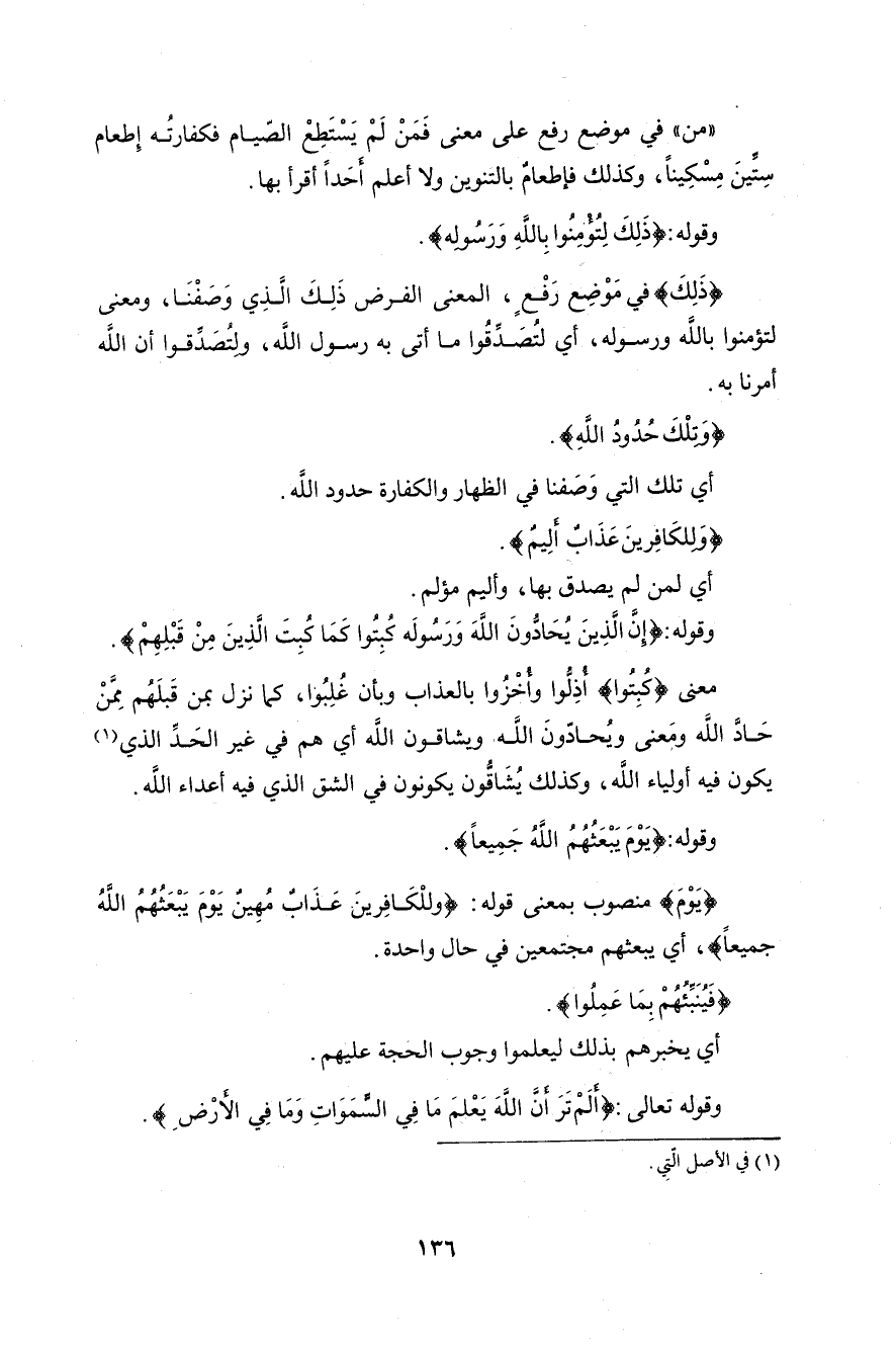 ومعنى (يُحَادُّونَ اللَّهَ) ويشاقون الله أي هم في غير الحَدِّ الذي يكون فيه أولياء اللَّه، وكذلك يُشَّاقُون يكونون في الشق الذي فيه أعداء اللَّه.