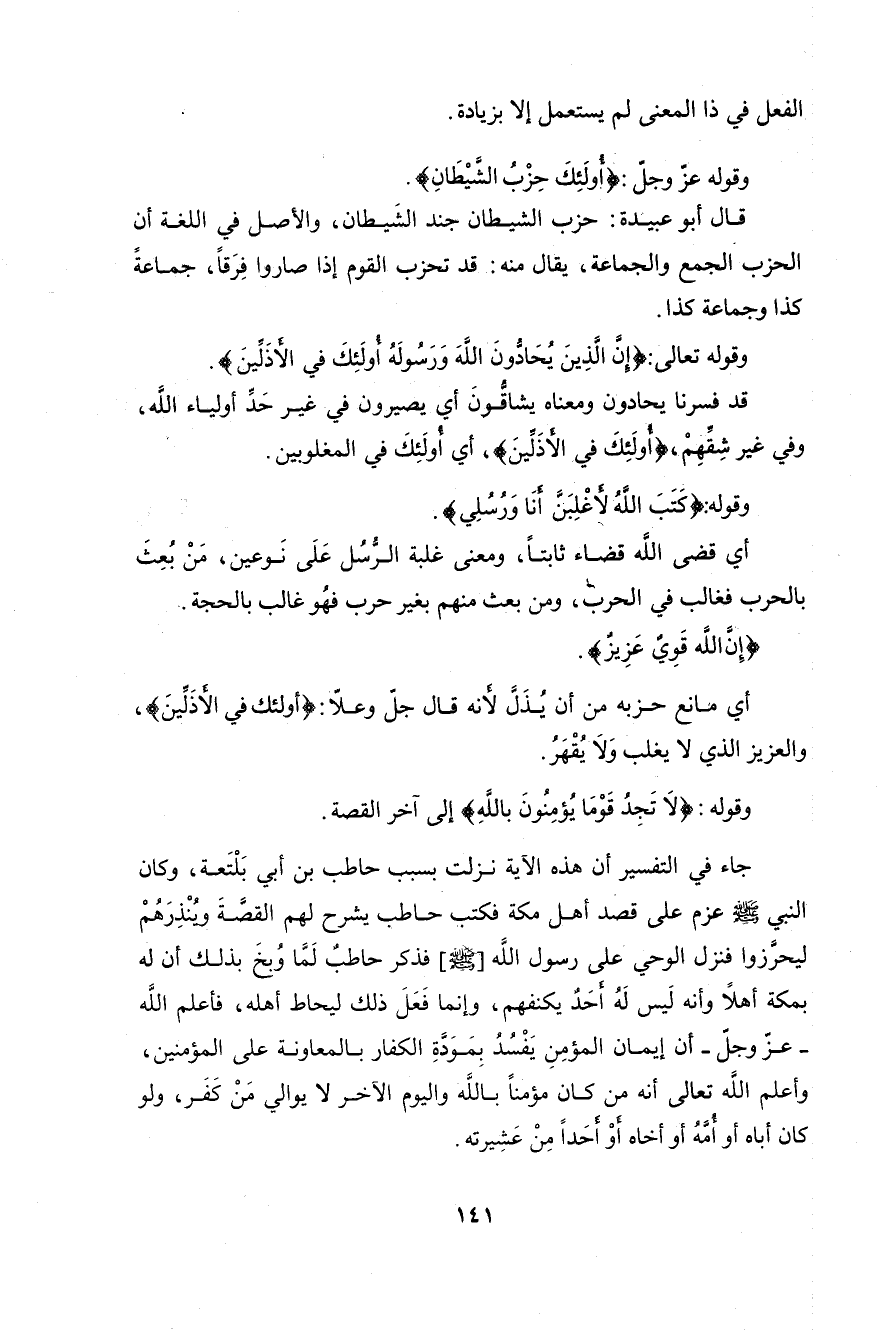 وقوله: (لَا تَجِدُ قَوْمًا يُؤْمِنُونَ بِاللَّهِ وَالْيَوْمِ الْآخِرِ يُوَادُّونَ مَنْ حَادَّ اللَّهَ وَرَسُولَهُ وَلَوْ كَانُوا آبَاءَهُمْ أَوْ أَبْنَاءَهُمْ أَوْ إِخْوَانَهُمْ أَوْ عَشِيرَتَهُمْ أُولَئِكَ كَتَبَ فِي قُلُوبِهِمُ الْإِيمَانَ وَأَيَّدَهُمْ بِرُوحٍ مِنْهُ وَيُدْخِلُهُمْ جَنَّاتٍ تَجْرِي مِنْ تَحْتِهَا الْأَنْهَارُ خَالِدِينَ فِيهَا رَضِيَ اللَّهُ عَنْهُمْ وَرَضُوا عَنْهُ أُولَئِكَ حِزْبُ اللَّهِ أَلَا إِنَّ حِزْبَ اللَّهِ هُمُ الْمُفْلِحُونَ (22)