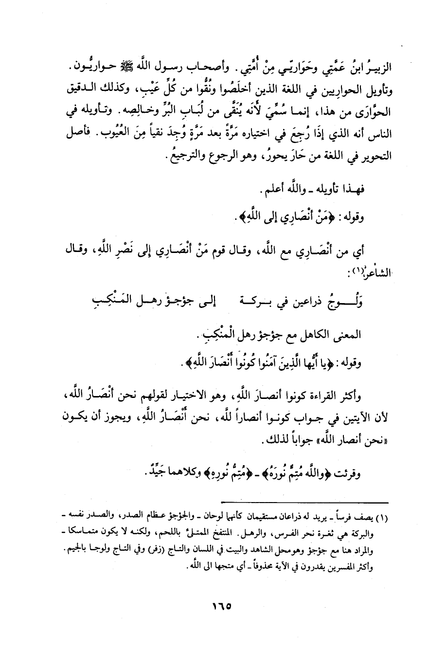 وتأويل الحوارِيين في اللغة الذين أخلَصُوا ونُقُّوا من كُل عَيْبِ، وكذلك الدقيق الحوارَى من هذا، إنما سُمِّيَ لأنَّه يُنَقى من لُبَابِ البُرِّ وخالِصِه. وتأويله في الناس أنه الذي إذَا رُجِعَ في اختياره مَرة بعد مَرةٍ وُجِدَ نقيًّا مِنَ العُيُوب.