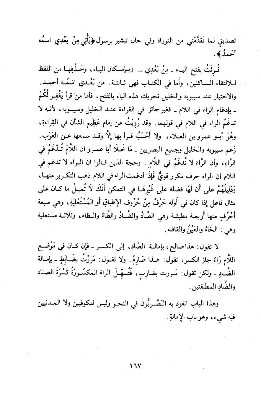لالتقاء السَّاكنين، وأَما في الكتاب فهي ثابتة. من بَعْدي اسمُه أحمد.