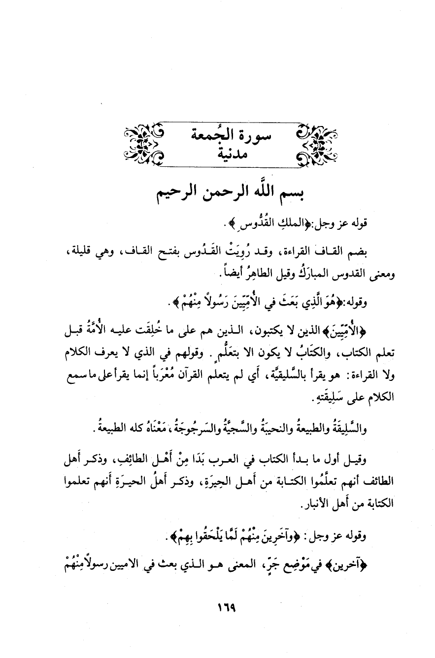 وقوله: (هُوَ الَّذِي بَعَثَ فِي الْأُمِّيِّينَ رَسُولًا مِنْهُمْ يَتْلُو عَلَيْهِمْ آيَاتِهِ وَيُزَكِّيهِمْ وَيُعَلِّمُهُمُ الْكِتَابَ وَالْحِكْمَةَ وَإِنْ كَانُوا مِنْ قَبْلُ لَفِي ضَلَالٍ مُبِينٍ (2)