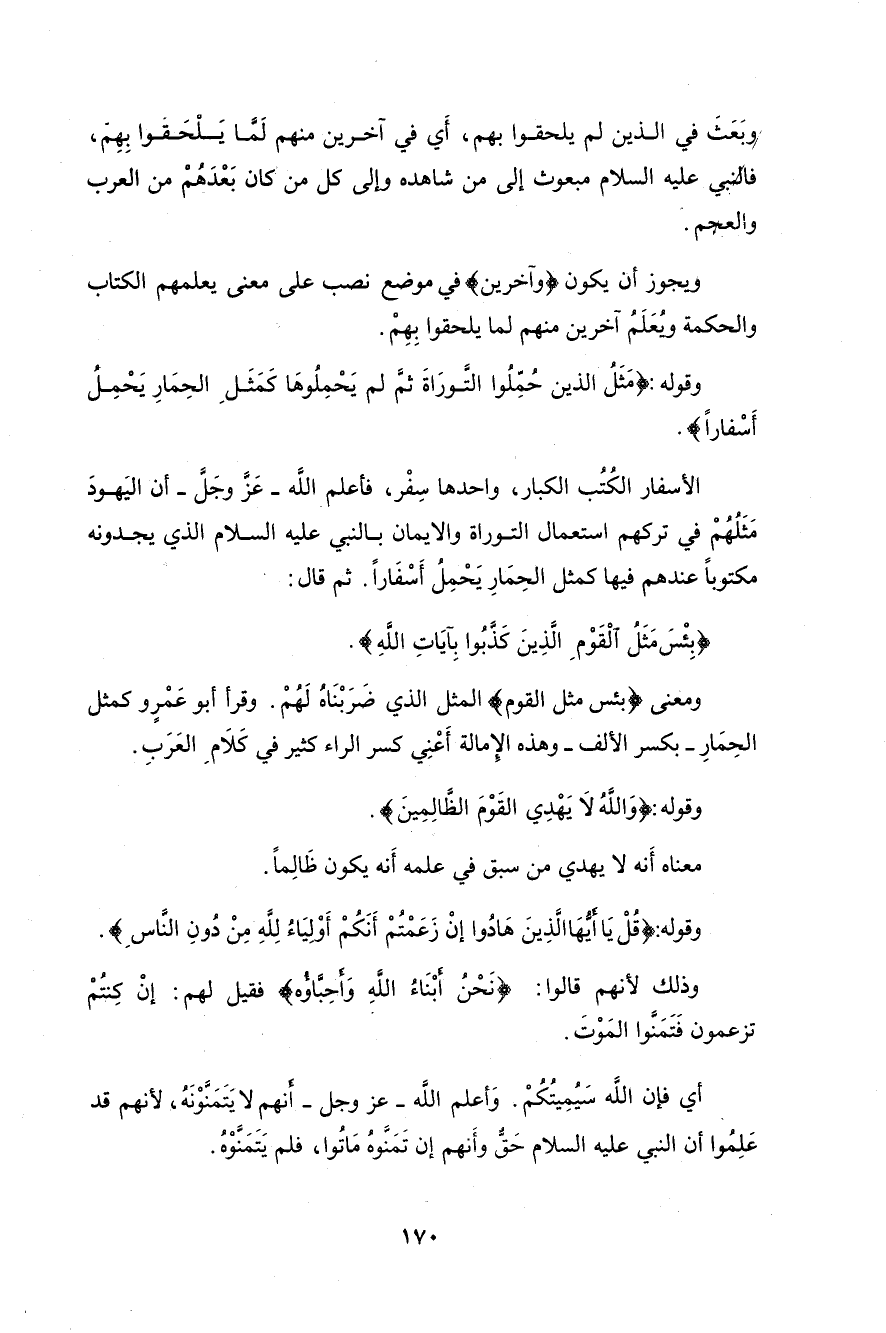 وقوله: (مَثَلُ الَّذِينَ حُمِّلُوا التَّوْرَاةَ ثُمَّ لَمْ يَحْمِلُوهَا كَمَثَلِ الْحِمَارِ يَحْمِلُ أَسْفَارًا بِئْسَ مَثَلُ الْقَوْمِ الَّذِينَ كَذَّبُوا بِآيَاتِ اللَّهِ وَاللَّهُ لَا يَهْدِي الْقَوْمَ الظَّالِمِينَ (5)