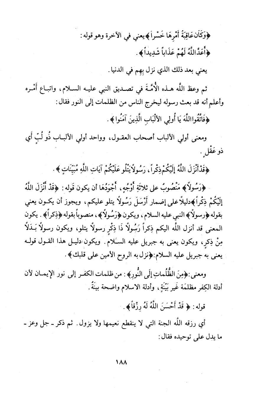 (قَدْ أَنْزَلَ اللَّهُ إِلَيْكُمْ ذِكْرًا (10) رَسُولًا يَتْلُو عَلَيْكُمْ آيَاتِ اللَّهِ مُبَيِّنَاتٍ لِيُخْرِجَ الَّذِينَ آمَنُوا وَعَمِلُوا الصَّالِحَاتِ مِنَ الظُّلُمَاتِ إِلَى النُّورِ وَمَنْ يُؤْمِنْ بِاللَّهِ وَيَعْمَلْ صَالِحًا يُدْخِلْهُ جَنَّاتٍ تَجْرِي مِنْ تَحْتِهَا الْأَنْهَارُ خَالِدِينَ فِيهَا أَبَدًا قَدْ أَحْسَنَ اللَّهُ لَهُ رِزْقًا (11)