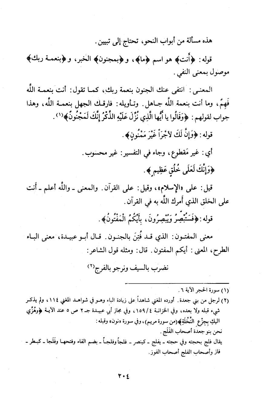 قوله: (أنت) هو اسم (ما)، و (بِمَجْنُونٍ) الخبر، و (بِنِعْمَةِ رَبِّكَ)