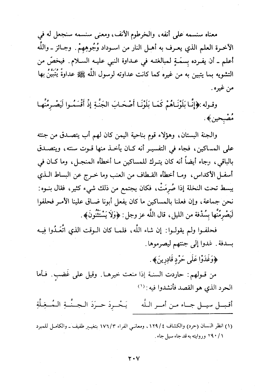 وقد فُسِّرت الآيةُ الكريمةُ بجميعِ ما ذَكَرَتْ. وقيل: الحَرْدُ اسمُ جنَّتِهم بعينِها، قاله السُّدي. وقيل: اسم قَرْيتِهم، قاله الأزهري. وفيهما بُعْدٌ بعيدٌ. و «قادرين»: إمَّا مِنْ القُدْرَةِ، وهو الظاهرُ، وإمَّا مِن التقدير وهو التضييقُ، أي: مُضَيِّقين على المساكينِ. وفي التفسيرِ قصةٌ توضِّحُ ما ذكرْتُ «.