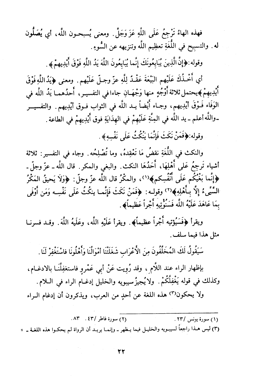 وقوله: (إِنَّ الَّذِينَ يُبَايِعُونَكَ إِنَّمَا يُبَايِعُونَ اللَّهَ يَدُ اللَّهِ فَوْقَ أَيْدِيهِمْ فَمَنْ نَكَثَ فَإِنَّمَا يَنْكُثُ عَلَى نَفْسِهِ وَمَنْ أَوْفَى بِمَا عَاهَدَ عَلَيْهُ اللَّهَ فَسَيُؤْتِيهِ أَجْرًا عَظِيمًا (10)