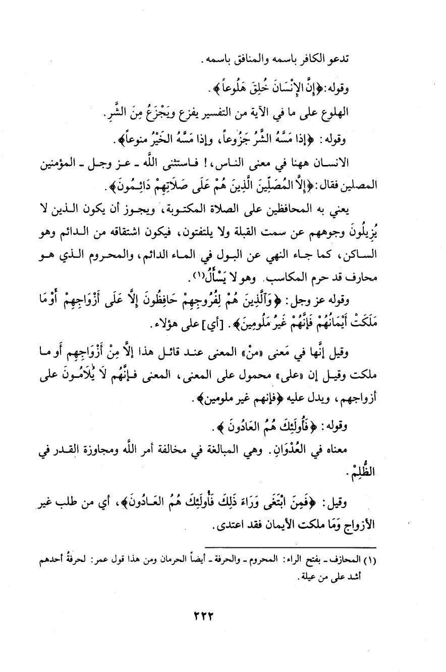 ويجوز أن يكون الذين لا يُزِيلُونَ وجوههم عن سمت القبلة ولا يلتفتون، فيكون اشتقاقه من الدائم وهو الساكن، كما جاء النهي عن البول في الماء الدائم، والمحروم الذي هو محارف قد حرم المكاسب. وهو لا يَسْألُ.