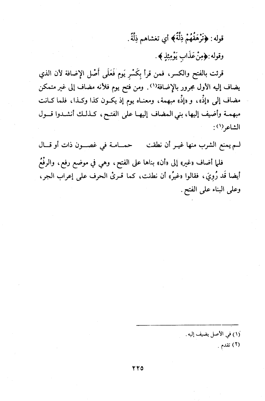 فلما أضاف " غير " إلى " أن " بناها على الفتح، وهي في موضع رفع، والرفْعُ أيضا قَد رُوِيَ، فقالوا " غيرُ " أن نطقت، كما قرئ الحرف على إعراب الجر، وعلى البناء على الفتح.