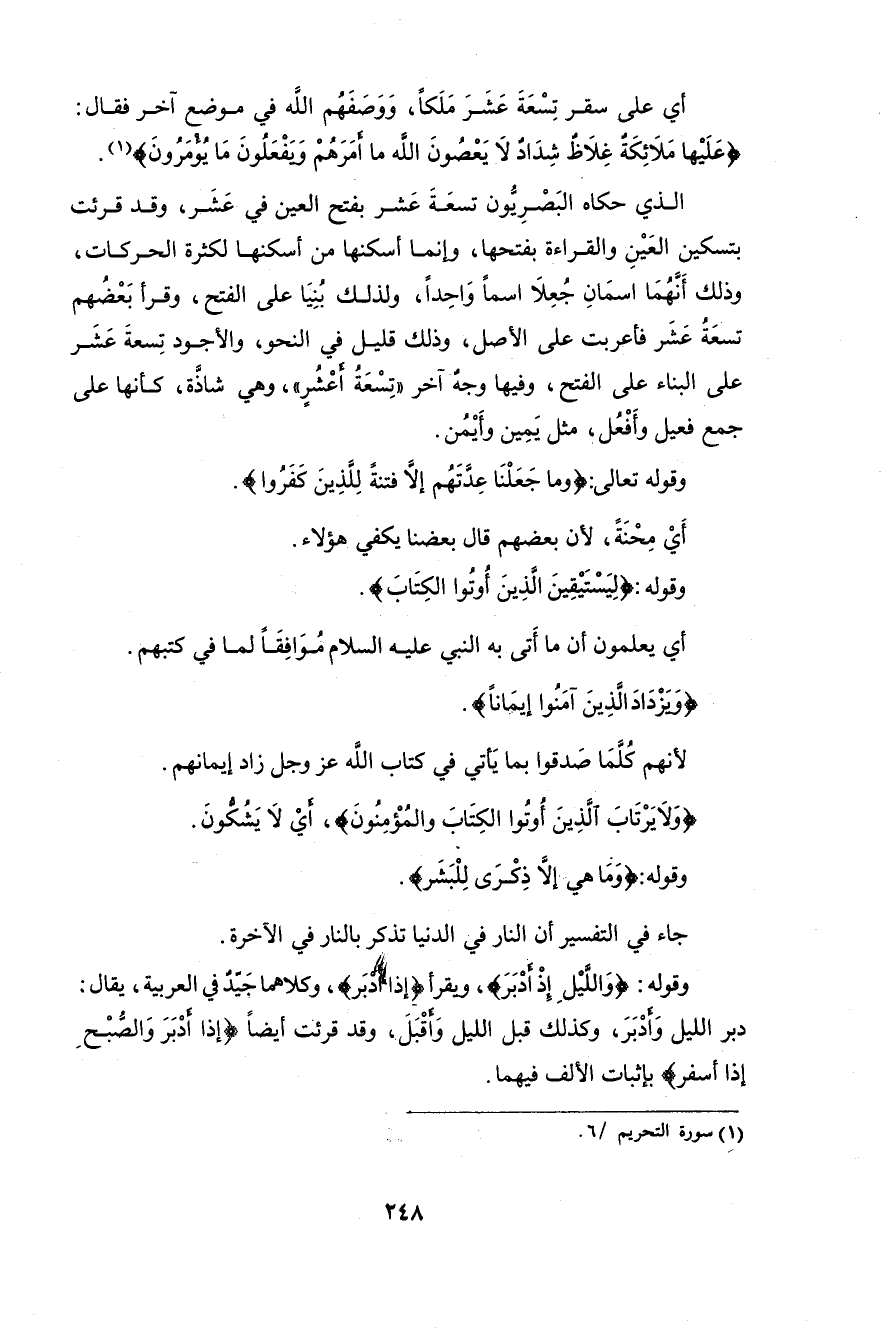 وقد قرئت بتسكين العَيْنِ، والقراءة بفتحها، وإنما أسكنها من أسكنها لكثرة الحركات، وذلك أَنَهمَا اسمَانِ جُعِلاَ اسماً وَاحِداً، ولذلك بُنِيَا على الفتح، وقرأ بَعْضهم تسعَةُ عَشَر فأعربت على الأصل، وذلك قليل في النحو، والأجود تِسعةَ عَشَر على البناء على الفتح، وفيها وجة آخر