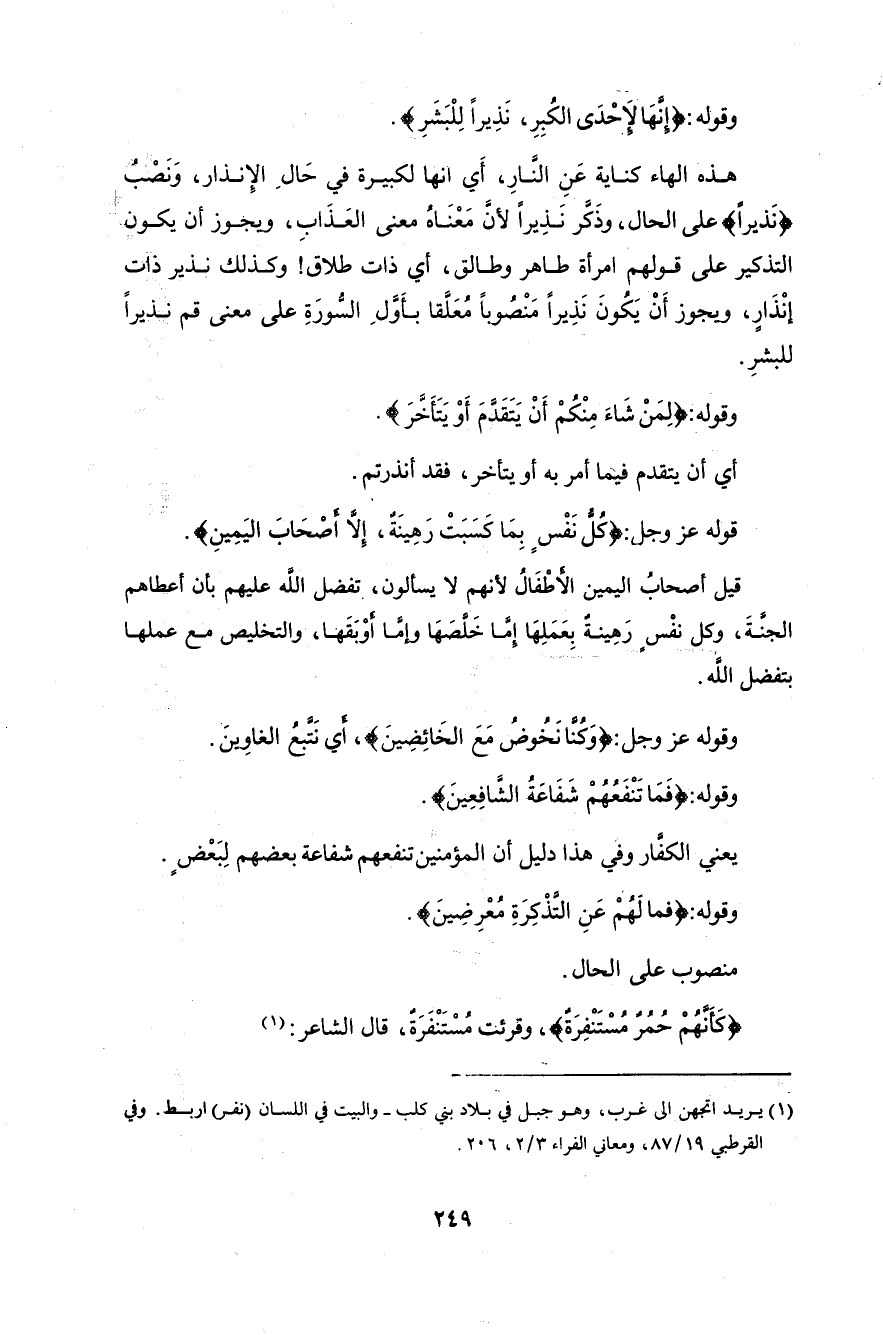 ويجوز أَنْ يَكُونَ (نَذِيرًا) مَنْصُوباً مُعَلَّقا بأولِ السورَةِ على معنى قم نذيراً