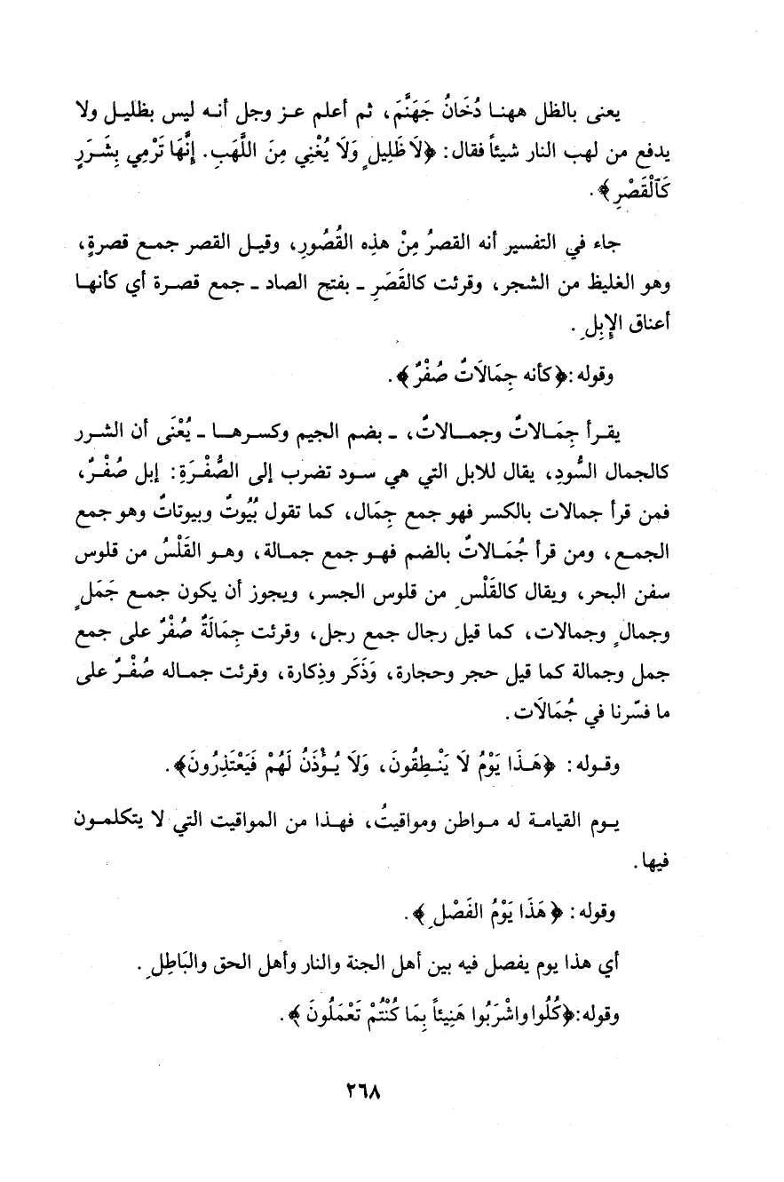 قوله: {صُفْرٌ} صفةٌ لجِمالات أو لِجمالة؛ لأنَّه: إمَّا جمعٌ أو اسمُ جمعٍ. والعامَّة على سكونِ الفاءِ جمعَ صفْراء. والحسنُ بضمِّها، وكأنَّه إتْباعٌ. وَوَقَعَ التشبيهُ هنا في غايةِ الفصاحةِ. قال الزمخشريُّ:» وقيل: صُفْرٌ سُوْدٌ تَضْرِبُ إلى الصُّفرة. وفي شعرِ عمرانَ بنِ حِطَّانَ الخارجيِّ: