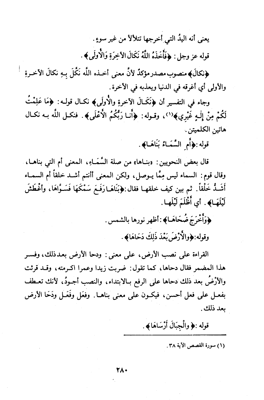(نَكَالَ) منصوب مصدر مؤكد لأن معنى أخذه اللَّه نَكَّلَ بِهِ نَكَالَ الْآخِرَةِ وَالْأُولَى أي أغرقه في الدنيا ويعذبه في الآخرة.