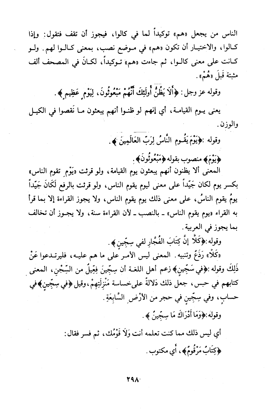 قوله: {لَفِي سِجِّينٍ}: اختلفوا في نون «سِجِّين». فقيل: هي أصليةٌ. اشتقاقهُ من السِّجْنِ وهو الحَبْسُ، وهو بناءُ مبالغةٍ، فسِجِّين من السَّجْنِّ كسِكِّير من السُّكْر. وقيل: بل هي بدلٌ من اللامِ، والأصلُ: سِجِّيْل، مشتقاً من السِّجِلِّ وهو الكتابُ. واختلفوا فيه أيضاً: هل هو اسمُ موضعٍ، أو اسمُ كتابٍ مخصوصٍ؟ وهل هو صفةٌ أو عَلَمٌ منقولٌ مِنْ وصفٍ كحاتِم. وهو مصروفٌ إذ ليس فيه إلاَّ سببٌ واحدٌ وهو العَلَمِيَّةُ، وإذا كان اسمَ مكانٍ، فقوله «كتابٌ مَرْقُوْمٌ»: إمَّا بدلٌ منه، أو خبرٌ لمبتدأ محذوفٍ، وهو ضميرٌ يعودُ عليه، وعلى التقديرَيْن فهو مُشْكِلٌ؛ لأنَّ الكتابَ ليس هو المكانَ فقيل: التقدير: هو مَحَلُّ كتابٍ، ثم حُذِفَ المضافُ. وقيل: التقديرُ: وما أدراك ما كتابُ سِجِّين؟ فالحذفُ، إمَّا مِنْ الأولِ، وإمَّا مِنْ الثاني: وأمَّا إذا قُلْنا: إنه اسمٌ ل «كتاب» فلا إشكال.
