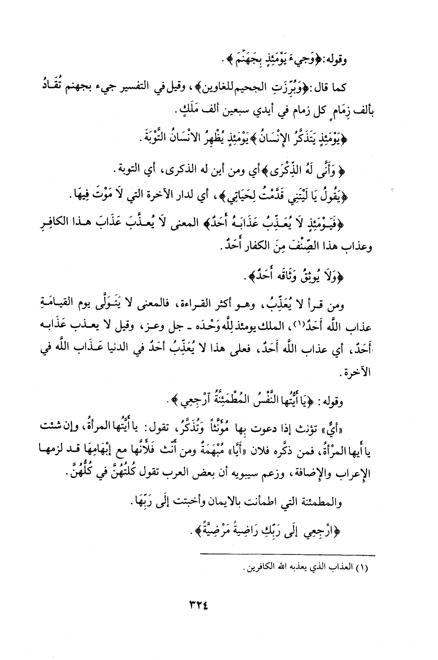 وقيل: المعنى لا يَكِلُ عذابه ولا وَثاقَه لأحدٍ؛ لأنَّ الأمرَ لله وحدَه في ذلك. وقيل: المعنى أنَّه في الشدة والفظاعةِ في حَيِّزٍ لم يُعَذِّبْ أحدٌ قط في الدنيا مثلَه. ورُدَّ هذا: بأنَّ «لا» إذا دَخَلَتْ على المضارعِ صَيَّرَتْه مستقبلاً، وإذا كان مستقبلاً لم يطابقْ هذا المعنى، ولا يُطْلَقُ على الماضي إلاَّ بمجازٍ بعيدٍ، وبأنَّ «يومَئذٍ» المرادُ به يومَ القيامة لا دارُ الدنيا. وقيل: المعنى أنَّه لا يُعَذِّبُ أحدٌ في الدنيا مثلَ عذابِ اللهِ الكافرَ فيها، إلاَّ أن هذا مردودٌ بما رُدَّ به ما قَبلَه. ويُحتمل عَوْدُه على الإِنسان بمعنى: لا يُعَذِّبُ أحدٌ من زبانيةِ العذابِ مثلَ ما يُعَذِّبون هذا الكافرَ، أو يكونُ المعنى: لا يَحْمِلُ أحدٌ عذابَ الإِنسانِ كقوله: {وَلاَ تَزِرُ وَازِرَةٌ وِزْرَ أخرى} [فاطر: 18]. وهذه الأوجهُ صَعْبَةُ المَرامِ على طالِبها من غيرِ هذا الموضوعِ لتفرُّقها في غيرِه وعُسْرِ استخراجِها منه.