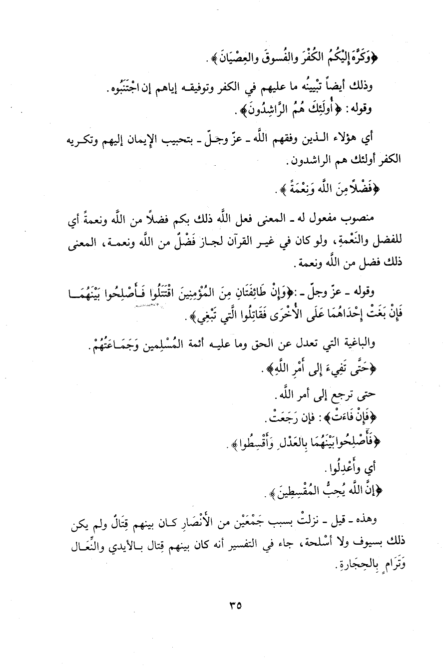 وقوله - عزَّ وجلَّ -: (وَإِنْ طَائِفَتَانِ مِنَ الْمُؤْمِنِينَ اقْتَتَلُوا فَأَصْلِحُوا بَيْنَهُمَا فَإِنْ بَغَتْ إِحْدَاهُمَا عَلَى الْأُخْرَى فَقَاتِلُوا الَّتِي تَبْغِي حَتَّى تَفِيءَ إِلَى أَمْرِ اللَّهِ فَإِنْ فَاءَتْ فَأَصْلِحُوا بَيْنَهُمَا بِالْعَدْلِ وَأَقْسِطُوا إِنَّ اللَّهَ يُحِبُّ الْمُقْسِطِينَ (9)
