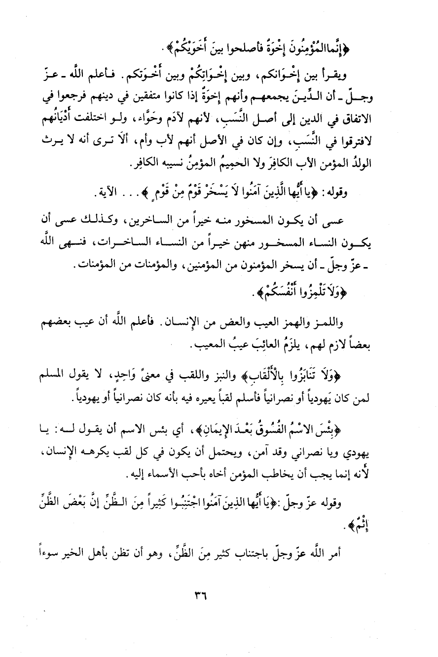 وقوله: يَا أَيُّهَا الَّذِينَ آمَنُوا لَا يَسْخَرْ قَوْمٌ مِنْ قَوْمٍ عَسَى أَنْ يَكُونُوا خَيْرًا مِنْهُمْ وَلَا نِسَاءٌ مِنْ نِسَاءٍ عَسَى أَنْ يَكُنَّ خَيْرًا مِنْهُنَّ وَلَا تَلْمِزُوا أَنْفُسَكُمْ وَلَا تَنَابَزُوا بِالْأَلْقَابِ بِئْسَ الِاسْمُ الْفُسُوقُ بَعْدَ الْإِيمَانِ وَمَنْ لَمْ يَتُبْ فَأُولَئِكَ هُمُ الظَّالِمُونَ (11)