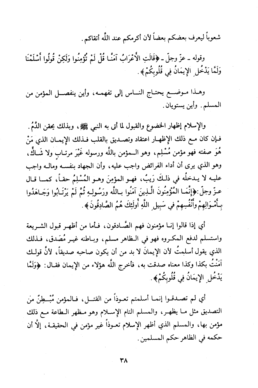 وقوله - عزَّ وجلَّ - (قَالَتِ الْأَعْرَابُ آمَنَّا قُلْ لَمْ تُؤْمِنُوا وَلَكِنْ قُولُوا أَسْلَمْنَا وَلَمَّا يَدْخُلِ الْإِيمَانُ فِي قُلُوبِكُمْ وَإِنْ تُطِيعُوا اللَّهَ وَرَسُولَهُ لَا يَلِتْكُمْ مِنْ أَعْمَالِكُمْ شَيْئًا إِنَّ اللَّهَ غَفُورٌ رَحِيمٌ (14)