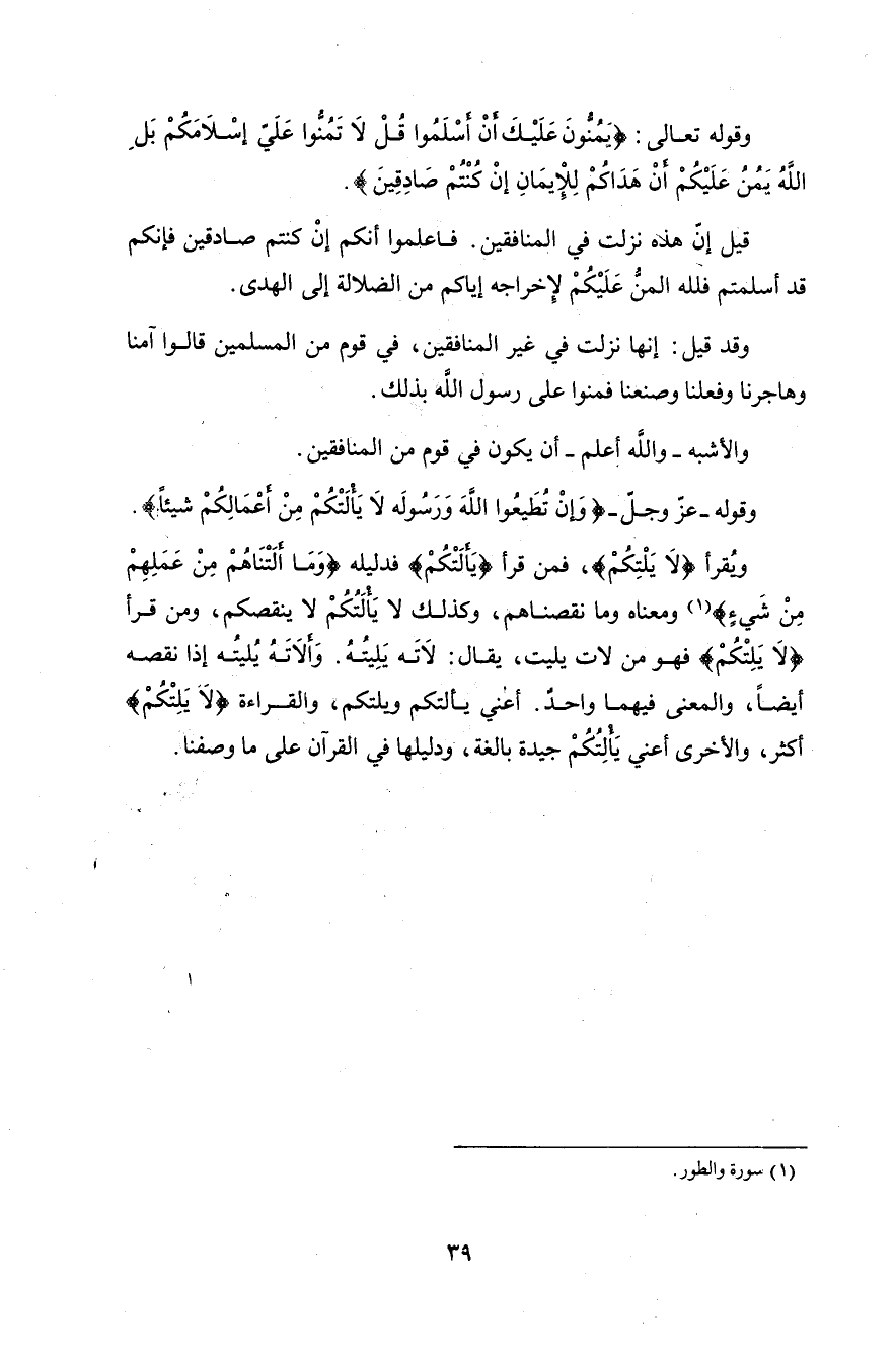 وقوله - عزَّ وجلَّ - (وَإِنْ تُطِيعُوا اللَّهَ وَرَسُولَهُ لَا يَلِتْكُمْ مِنْ أَعْمَالِكُمْ شَيْئًا).