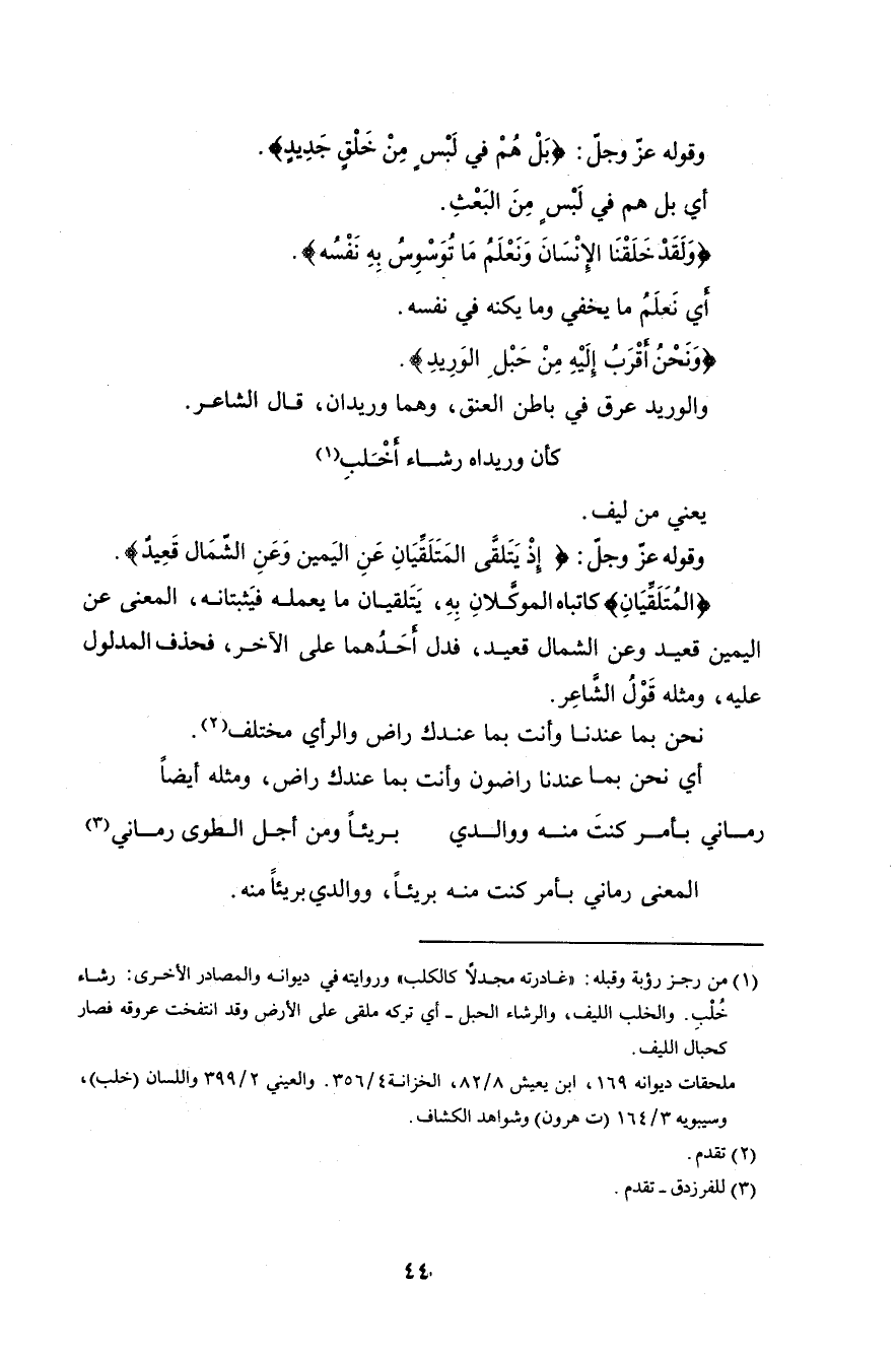 المعنى عن اليمين قعيد وعن الشمال قعيد، فدل أحَدُهما على الآخر، فحذف المدلول عليه، ومثله قَوْلُ الشاعِر.