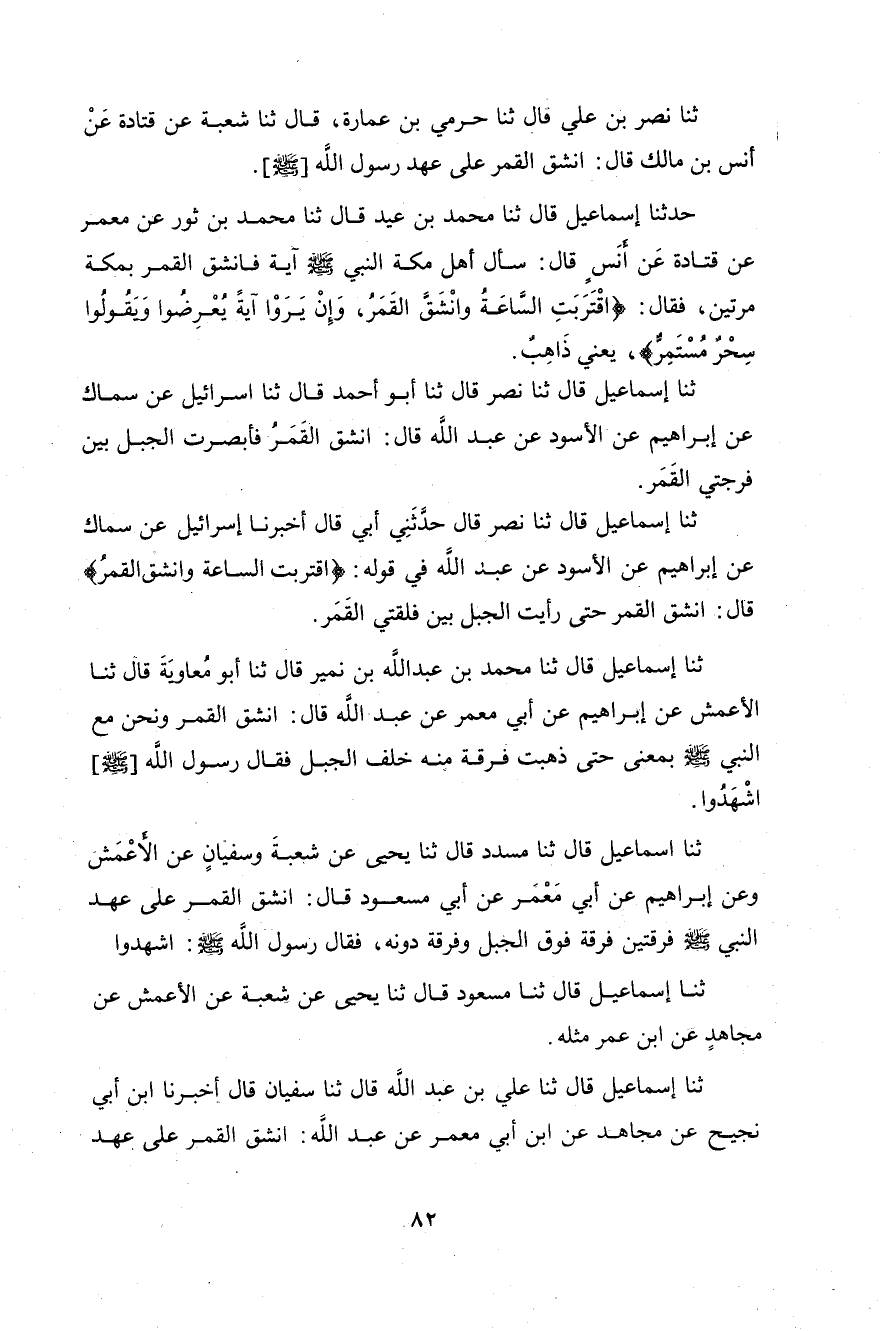 عن قتادة عَن أنَس قال: سأل أهل مكة النبي - صلى الله عليه وسلم - آية فانشق القمر بمكة مرتين، فقال: (اقْتَرَبَتِ السَّاعَةُ وَانْشَقَّ الْقَمَرُ (1) وَإِنْ يَرَوْا آيَةً يُعْرِضُوا وَيَقُولُوا سِحْرٌ مُسْتَمِرٌّ (2).