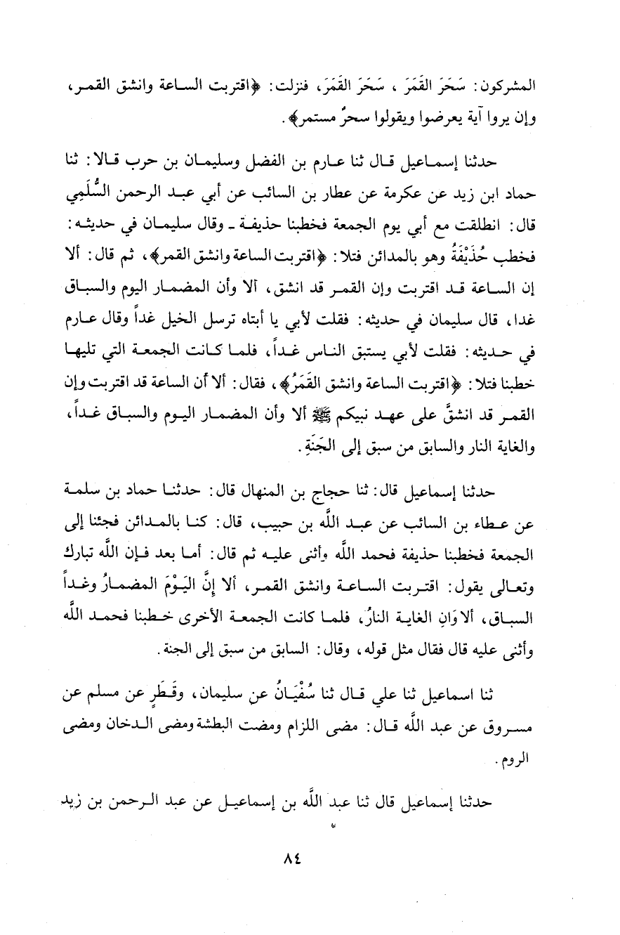 فخطب حذَيْفَةُ وهو بالمدائن فتلا: ((اقْتَرَبَتِ السَّاعَةُ وَانْشَقَّ الْقَمَرُ)، ثم قال: ألا إن الساعة قد اقتربت وإن القمر قد انشق، إلا وإن المضمار اليوم والسباق غدا، قال سليمان في حديثه: فقلت لأبي يا أبتاه ترسل الخيل غداً وقال عارم في حديثه: فقلت لأبي يستبق الناس غداً، فلما كانت الجمعة التي تليها خطبنا فتلا: ((اقْتَرَبَتِ السَّاعَةُ وَانْشَقَّ الْقَمَرُ)، فقال: ألا اُن الساعة قد اقتربت وإن القمر قد انشقَّ على عهد نبيكم - صلى الله عليه وسلم - ألا وإن المضمار اليوم والسباق غداً، والغاية النار والسابق من سبق إلى الجَنَّةِ.