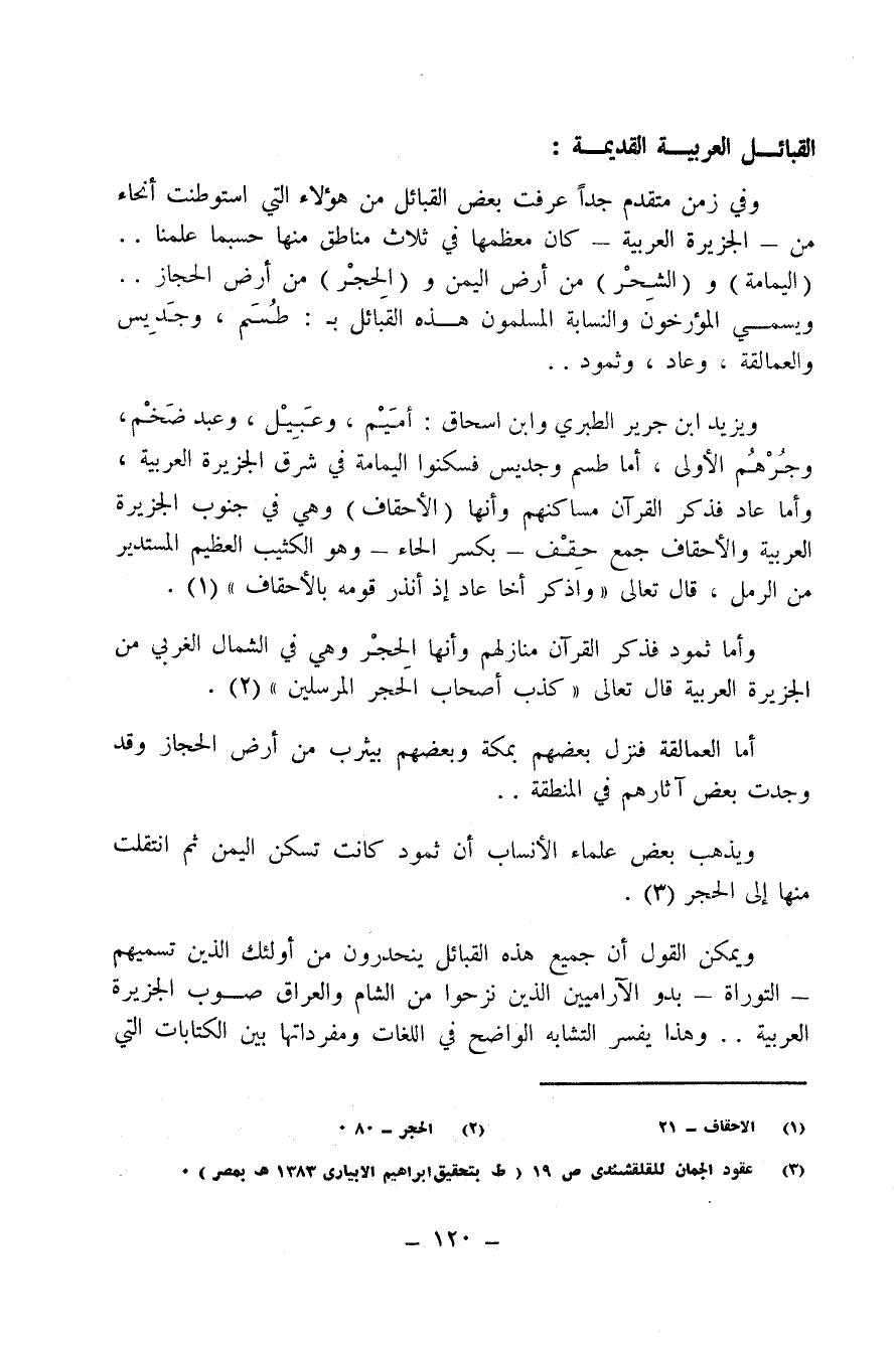 وفي زمن متقدم جداً عرفت بعض القبائل من هؤلاء التي استوطنت أنحاء من - الجزيرة العربية - كان معظمها في ثلاث مناطق منها حسبما علمنا.. (اليمامة) و (الشِحْر) من أرض اليمن و (الحِجْر) من أرض الحجاز.. ويسمي المؤرخون والنسابة المسلمون هذه القبائل بـ: طُسَم، وجَدِيس والعمالقة، وعاد، وثمود..