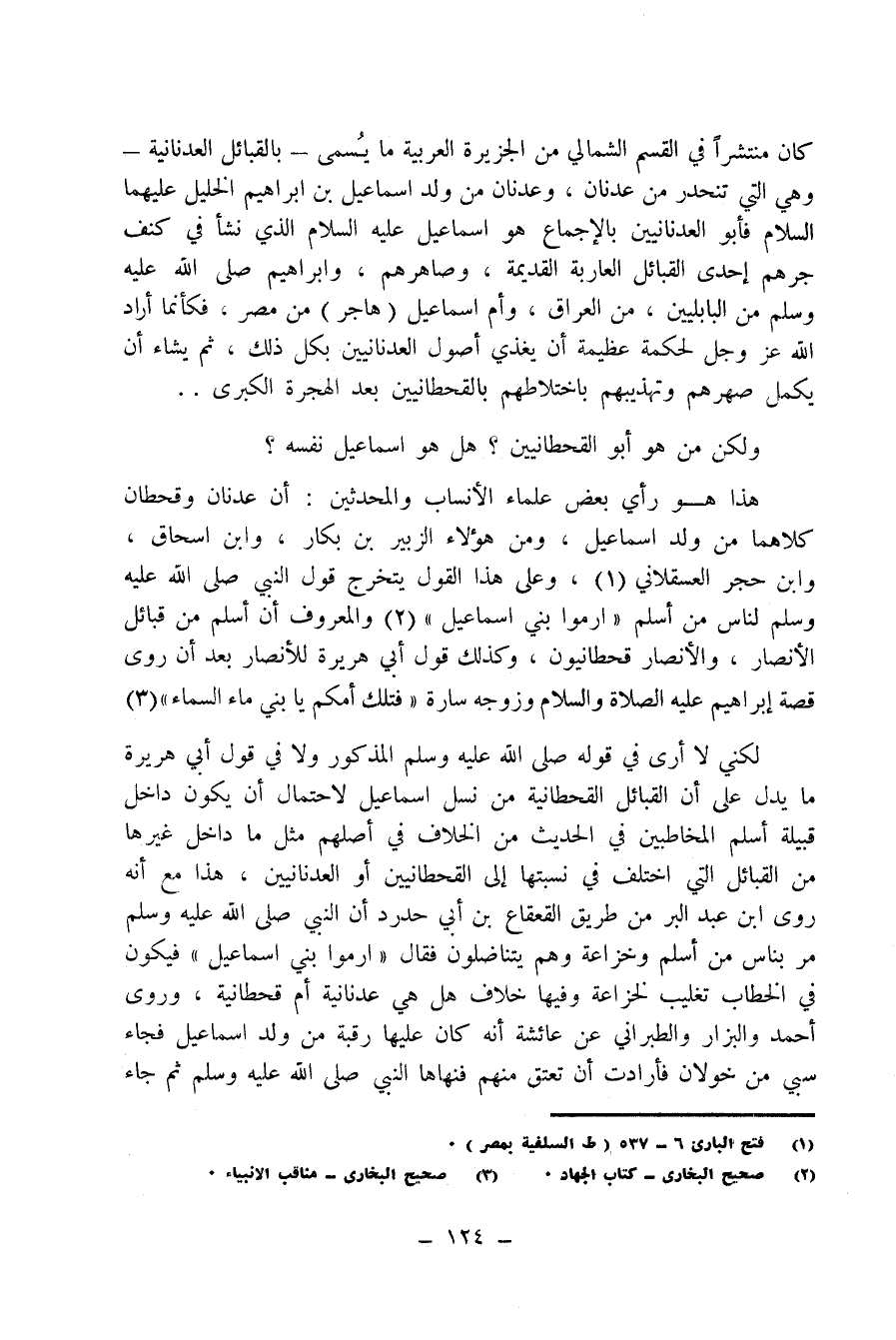 هذا هو رأي بعض علماء الأنساب والمحدثين: أن عدنان وقحطان كلاهما من ولد إسماعيل، ومن هؤلاء الزبير بن بكار، وابن إسحاق، وابن حجر العسقلاني1، وعلى هذا القول يتخرج قول النبي صلى الله عليه وسلم لناس من أسلم: "ارموا بني إسماعيل" 2 والمعروف أن أسلم من قبائل الأنصار، والأنصار قحطانيون، وكذلك قول أبي هريرة للأنصار بعد أن روى قصة إبراهيم عليه الصلاة والسلام وزوجه سارة: "فتلكم أمكم يا بني ماء السماء"3.