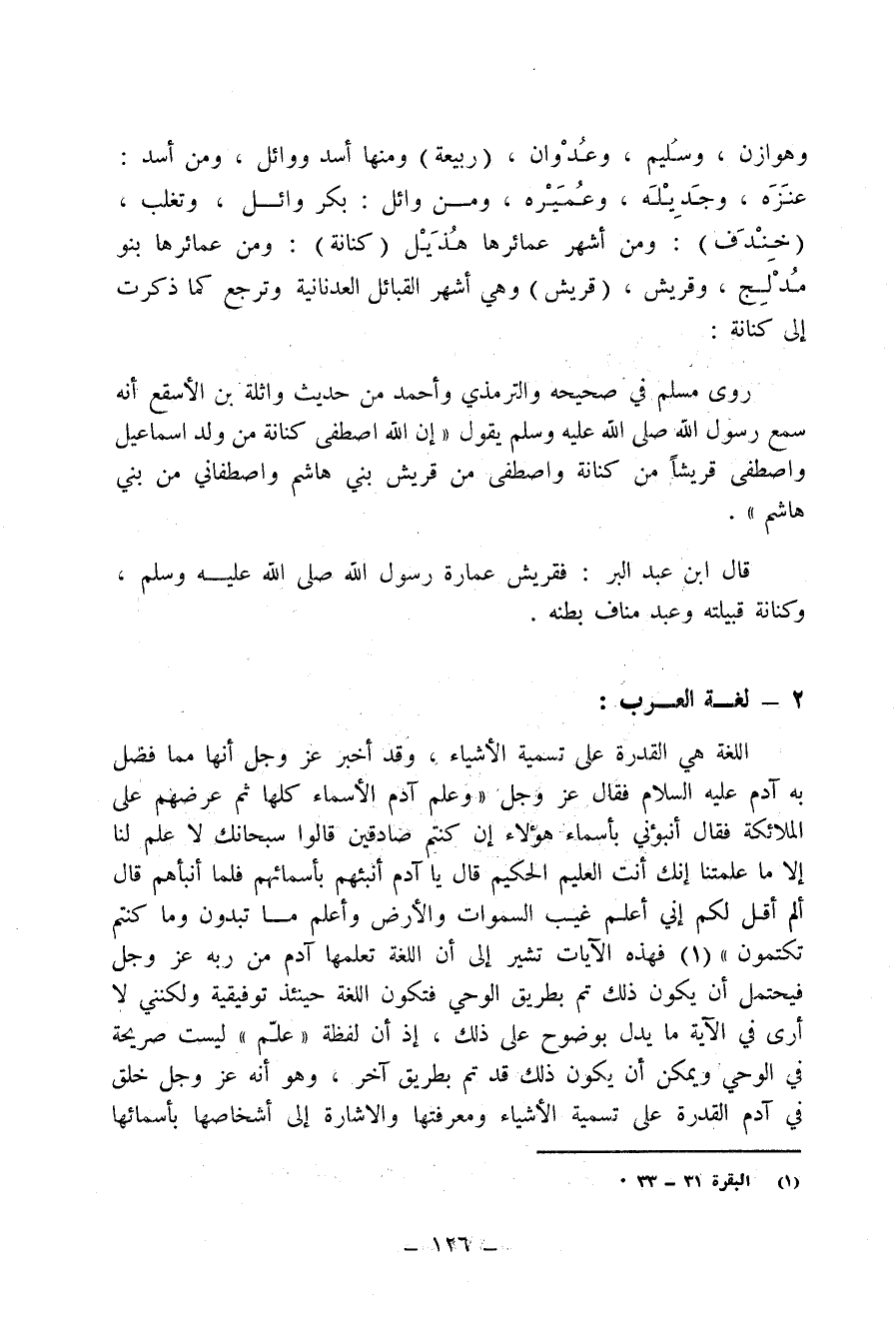 اللغة هي القدرة على تسمية الأشياء، وقد أخبر عز وجل أنها مما فضل به آدم عليه السلام فقال عز وجل: {وَعَلَّمَ آدَمَ الأَسْمَاءَ كُلَّهَا ثُمَّ عَرَضَهُمْ عَلَى الْمَلائِكَةِ فَقَالَ أَنْبِئُونِي بِأَسْمَاءِ هَؤُلاءِ إِنْ كُنْتُمْ صَادِقِينَ قَالُوا سُبْحَانَكَ لا عِلْمَ لَنَا إِلاَّ مَا عَلَّمْتَنَا إِنَّكَ أَنْتَ الْعَلِيمُ الْحَكِيمُ قَالَ يَا آدَمُ أَنْبِئْهُمْ بِأَسْمَائِهِمْ فَلَمَّا أَنْبَأَهُمْ بِأَسْمَائِهِمْ قَالَ أَلَمْ أَقُلْ لَكُمْ إِنِّي أَعْلَمُ غَيْبَ السَّمَاوَاتِ وَالأَرْضِ وَأَعْلَمُ مَا تُبْدُونَ وَمَا كُنْتُمْ تَكْتُمُونَ} 1 فهذه الآيات تشير إلى أن اللغة تعلمها آدم من ربه عز وجل فيحتمل أن يكون ذلك تم بطريق الوحي فتكون اللغة حينئذ توفيقية ولكنني لا أرى في الآية ما يدل بوضوح على ذلك، إذ أن لفظة (علّم) ليست صريحة في الوحي ويمكن أن يكون ذلك قد تم بطريق آخر، وهو أنه عز وجل خلق في آدم القدرة على تسمية الأشياء ومعرفتها والإشارة إلى أشخاصها بأسمائها