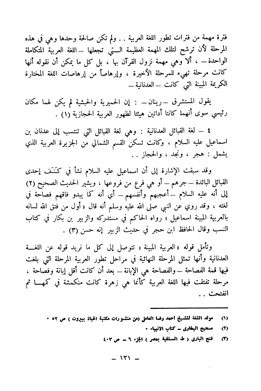 يقول المستشرق - رينان -: إن الحميرية والحبشية لم يكن لهما مكان رئيسي سوى أنهما كانتا أداتين هيئتا لظهور العربية الحجازية1.