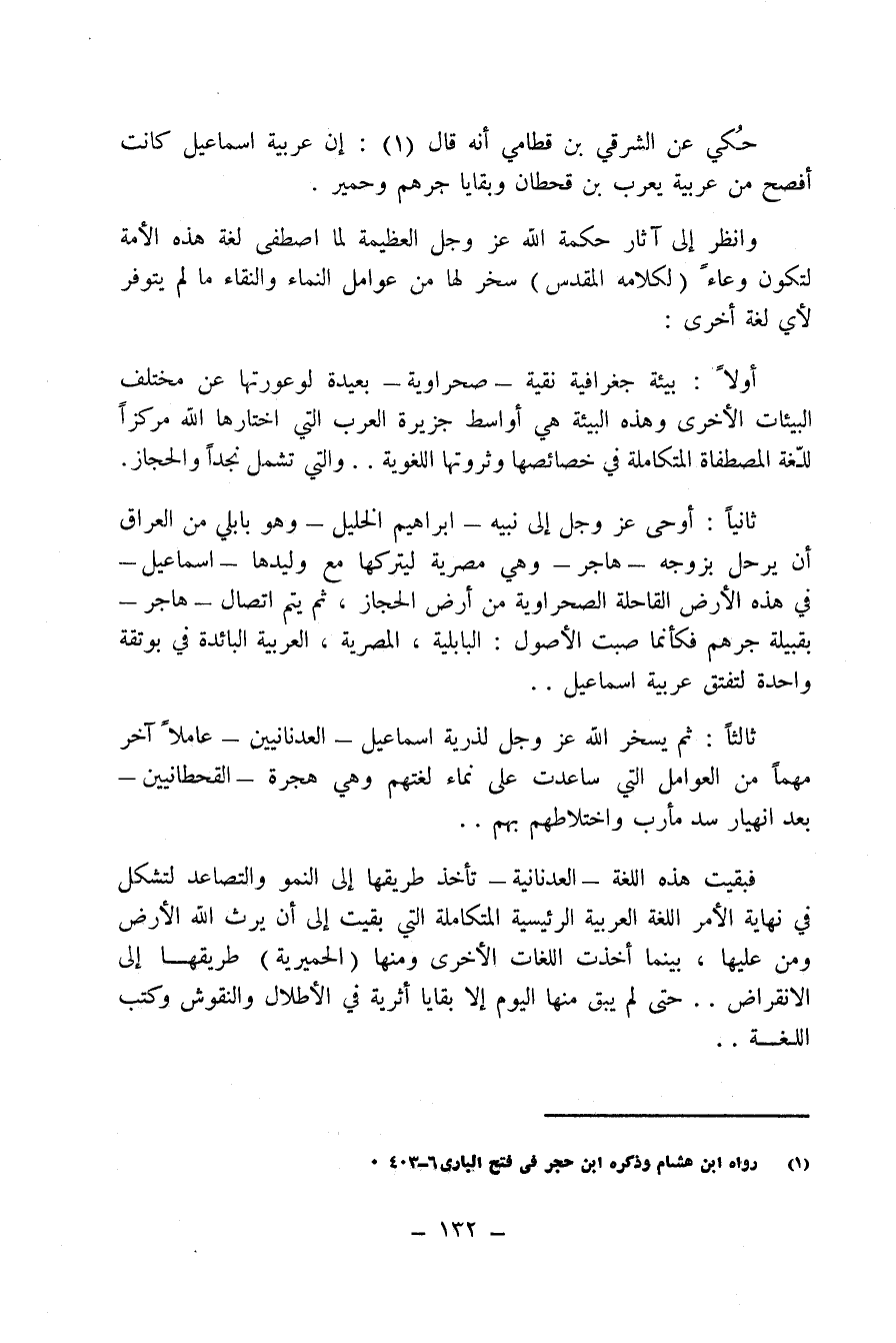 حُكي عن الشرقي بن قطامي أنه قال1: "إن عربية إسماعيل كانت أفصح من عربية يعرب بن قحطان وبقايا جرهم وحمير".