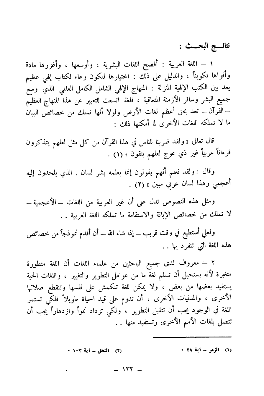1- اللغة العربية: أفصح اللغات البشرية، وأوسعها، وأغزرها مادة وأقواها تكويناً، والدليل على ذلك: اختيارها لتكون وعاء لكتاب إلهي عظيم بعد بين الكتب الإلهية المنزلة: المنهاج الإلهي الشامل الكامل العالمي الذي وسع جميع البشر وسائر الأزمنة المتعاقبة، فلغة اتسعت لتعبير عن هذا المنهاج العظيم - القرآن- تعد بحق أعظم لغات الأرض ولولا أنها تملك من خصائص البيان ما لا تملكه اللغات الأخرى لما أمكنها ذلك: