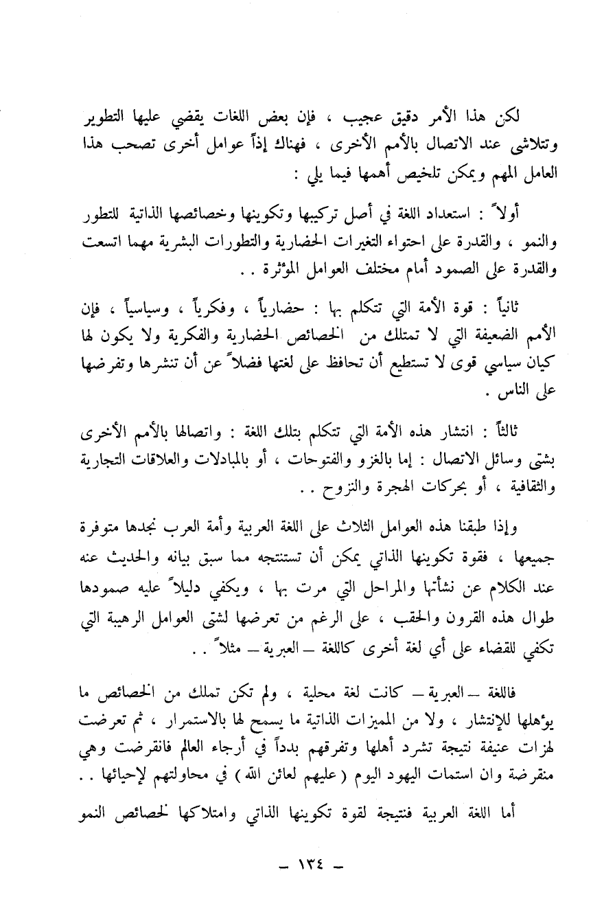 وإذا طبقنا هذه العوامل الثلاث على اللغة العربية وأمة العرب نجدها متوفرة جميعها، فقوة تكوينها الذاتي يمكن أن تستنتجه مما سبق بيانه والحديث عنه عند الكلام عن نشأتها والمراحل التي مرت بها، ويكفي دليلاً عليه صمودها طوال هذه القرون والحقب، على الرغم من تعرضها لشتى العوامل الرهيبة التي تفكي للقضاء على أي لغة أخرى كاللغة - العبرية - مثلاً..