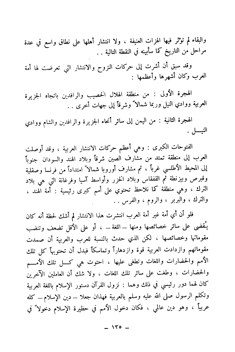 فلو أن أي أمة غير أمة العرب انتشرت هذا الانتشار لم أشك لحظة أنه كان يُقضى على سائر خصائصها ومنها - اللغة -، أو على الأقل تضعف وتنضب مقوماتها وخصائصها، لكن الذي حدث بالنسبة للعرب والعربية أن صمدت مقوماتهم وازدادت العربية قوة وازدهاراً وتماسكاً فبدل أن تحتويها كل تلك الأمم والحضارات واللغات وتطغى عليها، احتوت هي كل تلك الأمم والحضارات، وطغت على سائر تلك اللغات، ولا شك أن العاملين الآخرين كان لهما دون رئيسي في ذلك وهما: نزول القرآن دستور الإسلام باللغة العربية وتكلم الرسول صلى الله عليه وسلم بالعبرية فهذان جعلا - دين الإسلام - كله عربياً، وهو دين عالمي، فكان دخول الأمم في حظيرة الإسلام دخولاً في