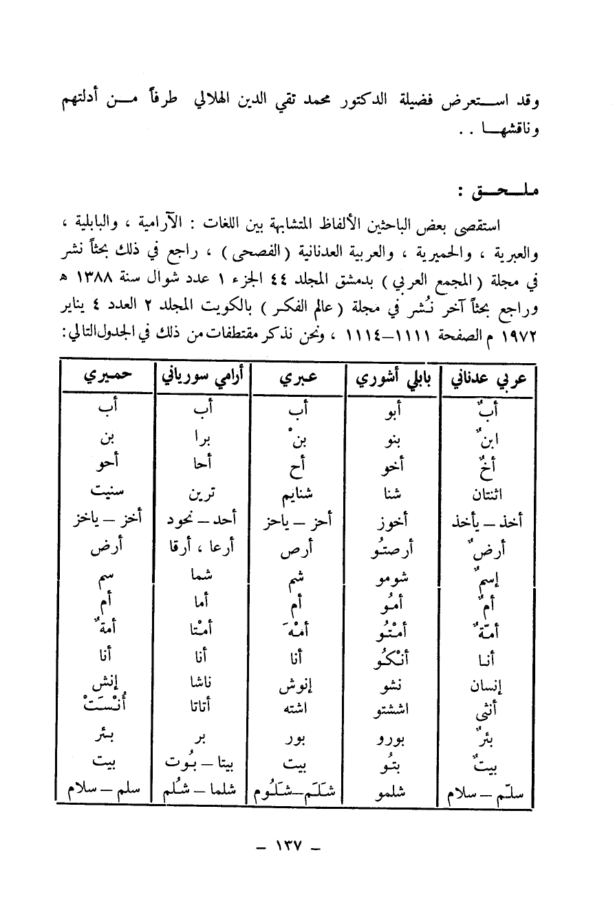 استقصى بعض الباحثين الألفاظ المتشابهة بين اللغات: الآرامية، والبابلية، والعبرية، والحميرية، والعربية العدنانية (الفصحى) ، راجع في ذلك بحثاً نشر في مجلة (المجمع العربي) بدمشق المجلد 44 الجزء 1 عدد شوال سنة 1388هـ وراجع بحثاً آخرا نُشر في مجلة (عالم الفكر) بالكويت المجلد 2 العدد 4 يناير 1972م الصفحة 1111-1114، ونحن نذكر مقتطفات من ذلك في الجدول التالي: