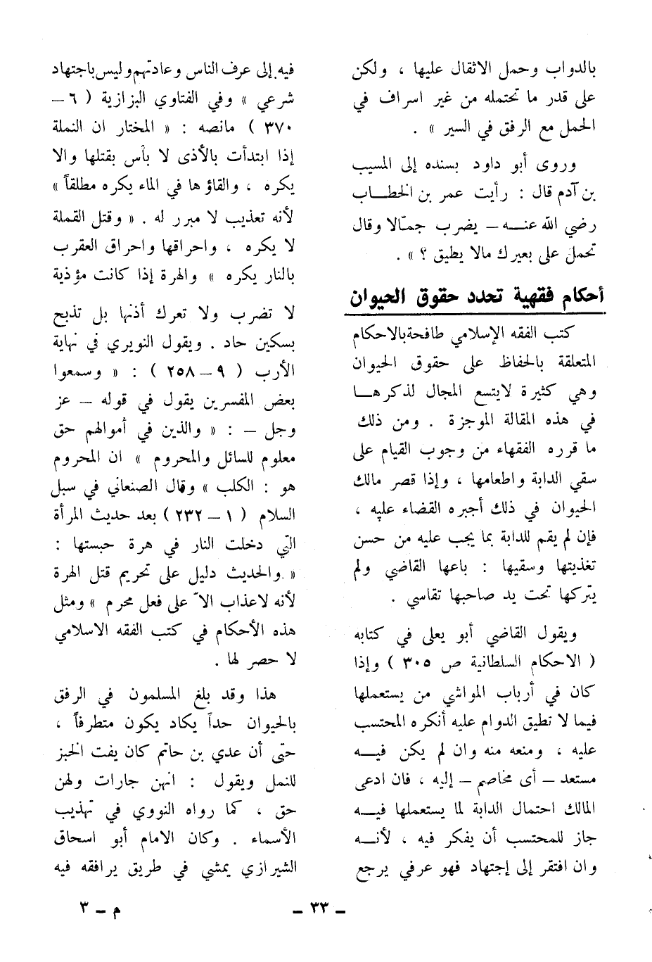 ويقول القاضي أبو يعلى في كتابه (الأحكام السلطانية ص 305) : "وإذا كان في أربا المواشي من يستعملها فيما لا تطيق الدوام عليه أنكره المحتسب عليه، ومنعه منه وإن لم يكن فيه مستعد _ أي مخاصم _ إليه، فإن ادعى المالك احتمال الدابة لما يستعملها فيه جاز للمحتسب أن يفكر فيه، لأنه وإن افتقر إلى اجتهاد فهو عرفي يرجع فيه إلى عرف الناس وعادتهم وليس باجتهاد شرعي".