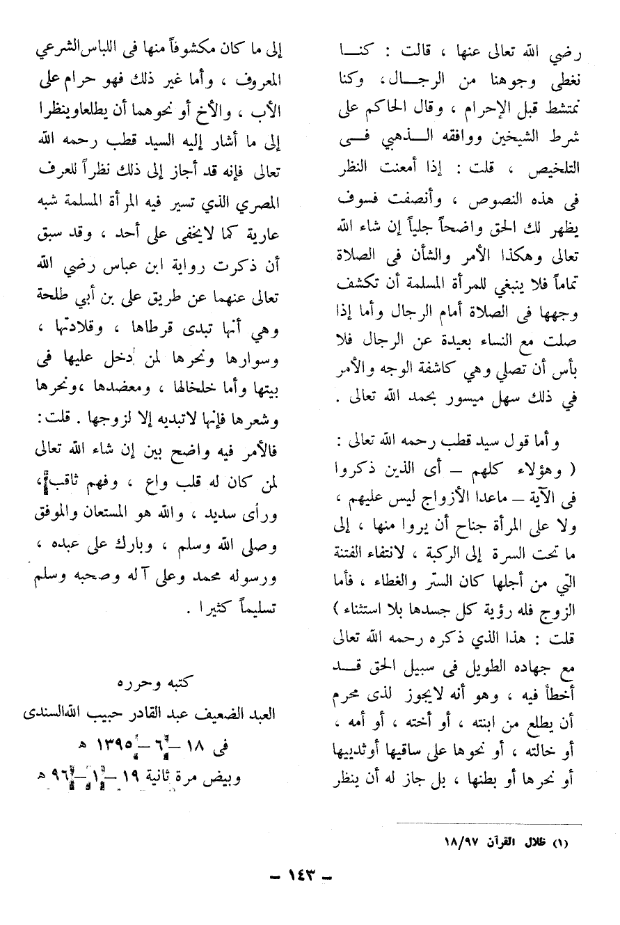 قلت: هَذَا الَّذِي ذكره رَحمَه الله تَعَالَى مَعَ جهاده الطَّوِيل فِي سَبِيل الْحق قد أَخطَأ فِيهِ، وَهُوَ أَنه لَا يجوز لذِي محرم أَن يطلع من ابْنَته، أَو أُخْته، أَو أمه، أَو خَالَته، أَو نَحْوهَا على سَاقيهَا أَو ثدييها أَو نحرها أَو بَطنهَا، بل جَازَ لَهُ أَن ينظر إِلَى مَا كَانَ مكشوفا مِنْهَا فِي اللبَاس الشَّرْعِيّ الْمَعْرُوف، وَأما غير ذَلِك فَهُوَ حرَام على الْأَب، وَالْأَخ أَو نَحْوهمَا أَن يطلعا وينظرا إِلَى مَا أَشَارَ إِلَيْهِ السَّيِّد قطب رَحمَه الله تَعَالَى فَإِنَّهُ قد جَازَ إِلَى ذَلِك نظرا للْعُرْف الْمصْرِيّ الَّذِي تسير فِيهِ الْمَرْأَة الْمسلمَة شبه عَارِية كَمَا لَا يخفى على أحد، وَقد سبق أَن ذكرت رِوَايَة ابْن عَبَّاس رَضِي الله تَعَالَى عَنْهُمَا من طَرِيق عَليّ بن أبي طَلْحَة وَهِي أَنَّهَا تبدي قرطاها، وقلادتها، وسوارها ونحرها لمن دخل عَلَيْهَا فِي بَيتهَا وَأما خلْخَالهَا، ومعضدها، ونحرها وشعرها فَإِنَّهَا لَا تبديه إِلَّا لزَوجهَا.