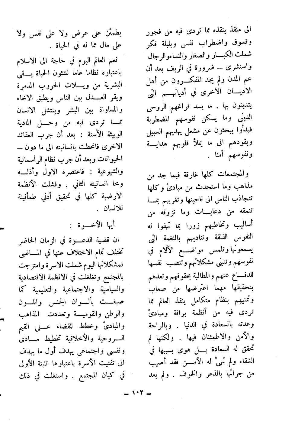 نعم العالم اليوم في حاجة إلى الإسلام باعتباره نظاما عاما لشئون الحياة يقي البشرية من ويلات الحروب المدمرة ويقر العدل بين الناس ويطبق الإخاء والمساواة بين البشر وينشل الإنسان مما تردى فيه من وحل المادية الوبيئة الآسنة: بعد أن جرب العقائد الأخرى فانحطت بإنسانيته إلى ما دون ـ الحيوانات وبعد أن جرب نظام الرأسمالية والشيوعية: فاعتصره الأول وأذله ومحا إنسانيته الثاني. وفشلت الأنظمة الأرضية كلها في تحقيق أدنى طمأنينة للإنسان.