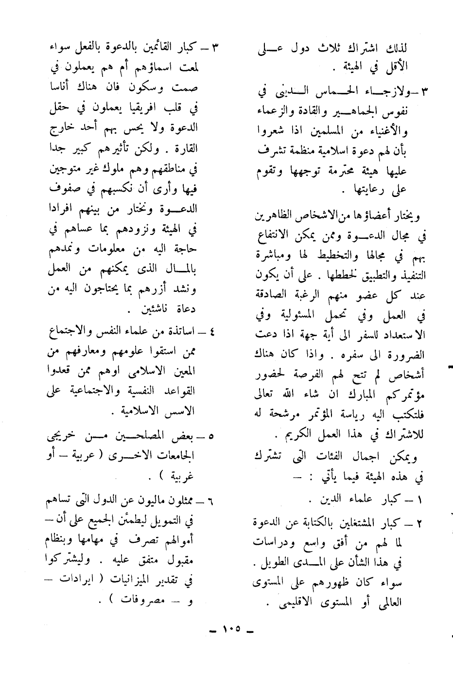 ويختار أعضاؤعها من الأشخاص الظاهرين في مجال الدعوة ممن يمكن الإنتفاع بهم في مجالها والتخطيط لها ومباشرة التنفيد والتطبيق لخططها. على أن يكون عند كل عضو منهم الرغبة الصادقة في العمل وفي تحمل المسؤولية وفي الإستعداد للسفر لأية جهة إذا دعت الضرورة إلى سفره. وإذا كان هناك أشخاص لم تتح لهم الفرصة لحضور مؤتمركم المبارك إن شاء الله تعالى فلتكتب إليه رياسة المؤتمر مرشحة له للاشتراك في هذا العمل الكريم.