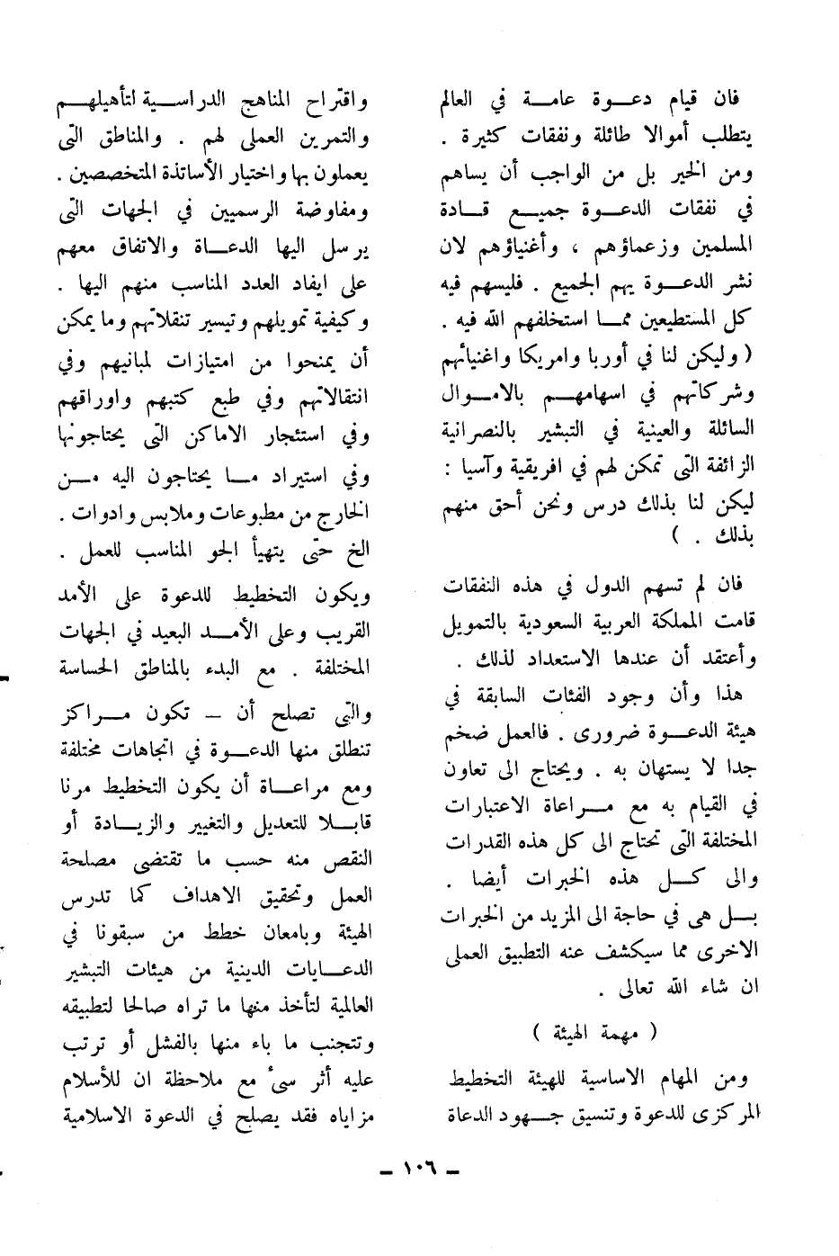 ومن المهام الأساسية للهيئة التخطيط المركزي للدعوة وتنسيق جهود الدعاة واقتراح المناهج الدراسية لتأهيلهم والتمرين العملي لهم. والمناطق التي يعملون بها واختيار الأساتذة المتخصصين. ومفاوضة الرسميين من الجهات التي يرسل إليها الدعاة والاتفاق معهم على إيفاد العدد المناسب منهم إليها. وكيفية تمويلهم وتيسير تنقلاتهم وما يمكن أن يمنحوا من امتيازات لمبانيهم وفي انتقالاتهم وفي طبع كتبهم وأوراقهم وفي استئجار الأماكن التي يحتاجونها وفي استيراد ما يحتاجون إليه من الخارج من مطبوعات وملابس وأدوات. إلخ حتى يتهيأ الجو المناسب للعمل. ويكون التخطيط للدعوة على الأمد القريب وعلى الأمد البعيد في الجهات المختلفة. مع البدء بالمناطق الحساسة والتي تصلح أن تكون مراكز تنطلق منها الدعوة في اتجاهات مختلفة ومع مراعاة أن يكون التخطيط مرناً قابلاً للتعديل والتغيير والزيادة أو النقص منه حسب ما تقتضي مصلحة العمل وتحقيق الأهداف كما تدرس الهيئة وبإمعان خطط من سبقونا في الدعايات الدينية من هيئات التبشير العالمية لتأخذ منها ما تراه صالحاً لتطبيقه وتجنب ما باء منها بالفشل أو ترتب عليه أثر سيء مع ملاحظة أن للإسلام مزاياه قد يصلح في الدعوة الإسلامية