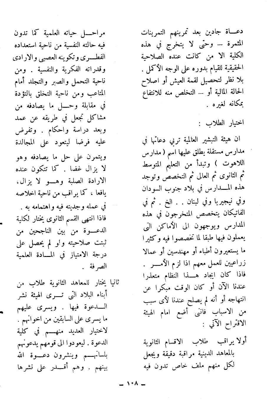 دعاة جادين بعد تمرينهم التمرينات المثمرة، وحتى لا يتخرج في هذه الكلية إلا من كانت عنده الصلاحية الحقيقية للقيام بدوره على الوجه الأكمل. بلا نظر لتحصيل لقمة العيش أو إصلاح الحالة المالية أو التخلص منه للانتفاع بمكانه لغيره.