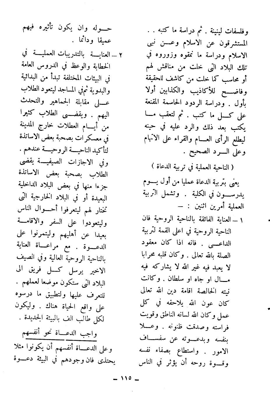 2ـ العناية بالتدريبات العملية في الخطابة والوعظ في الدروس العامة في البيئات المختلفة تبدأ من البدائية والبدوية ثم في المساجد ليتعود الطلاب على مقابلة الجماهير والتحدث إليهم. ويقضي الطلاب كثيراً من أيام العطلات خارج المدينة في معسكرات بصحبة بعض الأساتذة لتأكيد الناحية الروحية عندهم. وفي الإجازات الصيفية يقضي الطلاب بصحبة بعض الأساتذة جزءاً منها في بعض البلاد الداخلية البعيدة أو في البلاد الخارجية التي تختار لهم ليتعرفوا أحوال الناس وليتعودوا على السفر والإقامة بعيداً عن أهليهم وليتمرنوا على الدعوة. مع مراعاة العناية بالناحية الروحية العالية وفي الصيف الأخير يرسل كل فريق إلى البلاد التي سيكلفون موضعاً لعملهم. للتعرف عليها ولتطبيق ما درسوه على واقع الحياة هناك. وليكون لكل طالب ألف بالبيئة الجديدة.