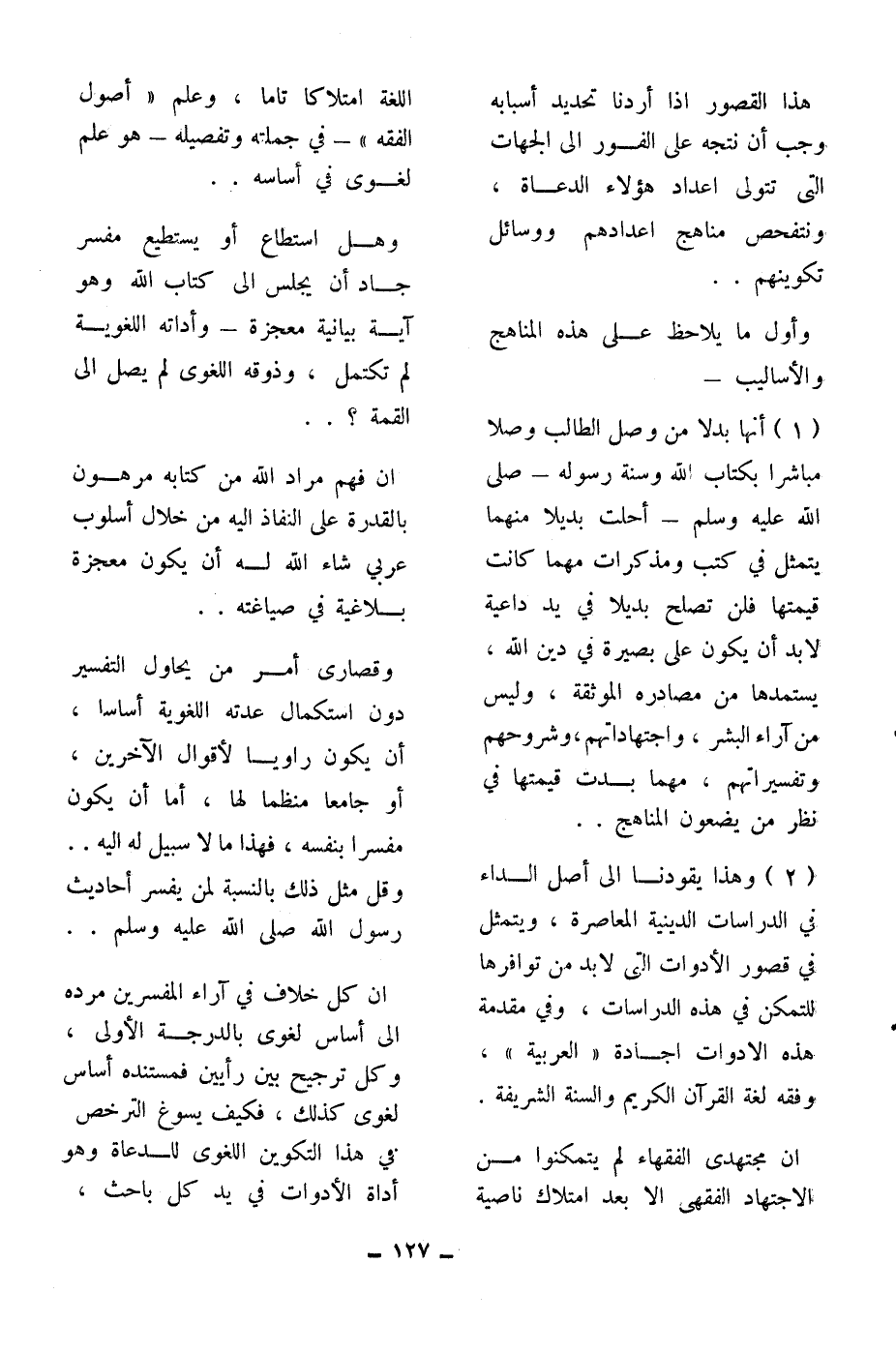 (2) وهذا يقودنا إلى أصل الداء في الدراسات الدينية المعاصرة، ويتمثل في قصور الأدوات التي لا بد من توافرها للتمكن في هذه الدراسات، وفي مقدمة هذه الأدوات ((العربية)) ، وفقه لغة القرآن الكريم والسنة الشريفة.